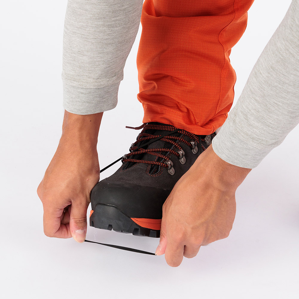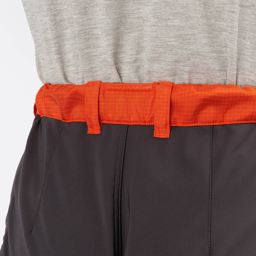 膝に立体裁断を施した登山用パンツを元に設計し、背面にはストレッチ素材を使用している為、歩行時のつっぱり感なく、スムーズな屈伸運動や足上げが可能です。また、すっきりとしたシルエットで、はきやすく動きやすいのも特長です。