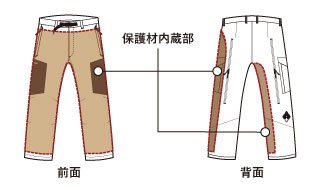 保護材内蔵部:脚部分の前側全体と、着用者からみて左脚外側の脇線と右足内側のそれぞれから50mm出たところまでと、股下部分から200mm上部まで。