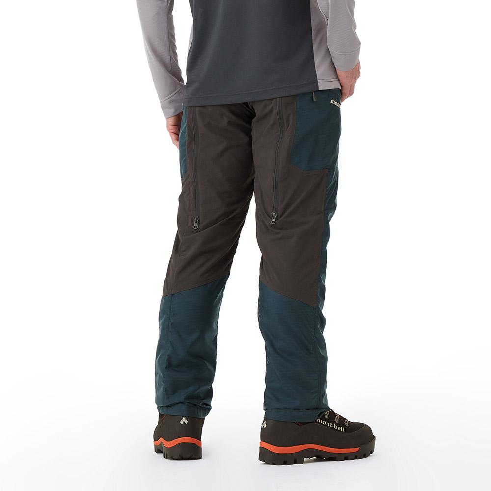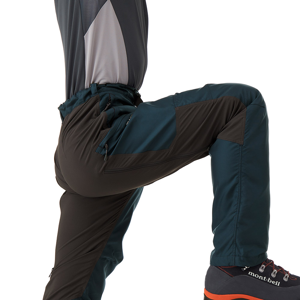 登山用パンツを元にパターンを設計し、膝には立体裁断を施し、背面にはストレッチ素材を使用している為、歩行時のつっぱり感なく、スムーズな屈伸運動や足上げが可能です。また、すっきりとしたシルエットで、はきやすく動きやすいのも特徴です。