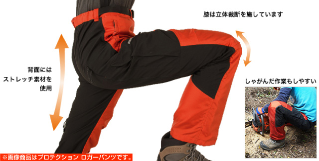 チェーンソーから体を守る特殊保護材を内蔵。チェーンソーの刃が特殊保護材に触れると、瞬時に繊維が引き出され、刃に絡み付く事で回転をストップさせます。