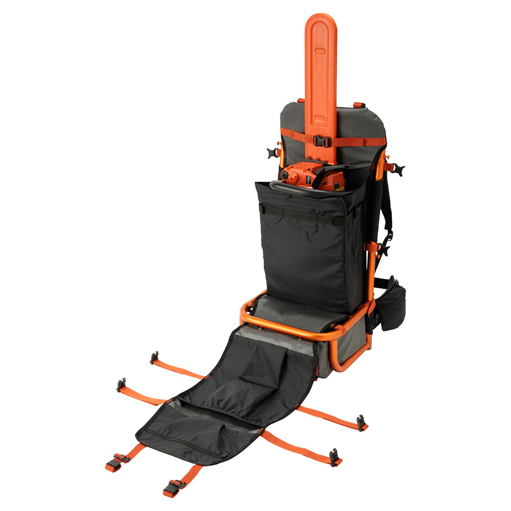 ロガーフレームパックに装着することでチェーンソー、燃料、工具など、伐採作業に必要な荷物を効率よくセットでき、安定した運搬を可能にします。120ccほどの大型チェーンソーにも対応する、固定ポケットを備えています。