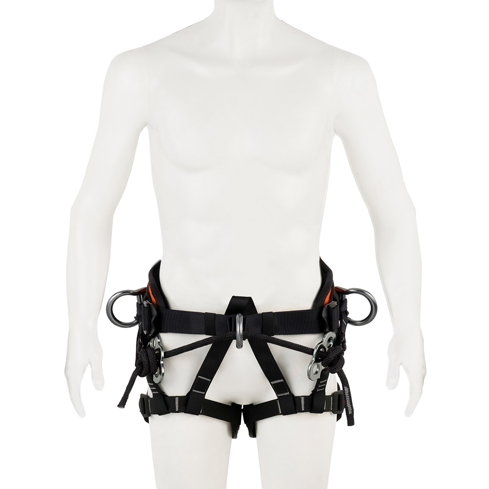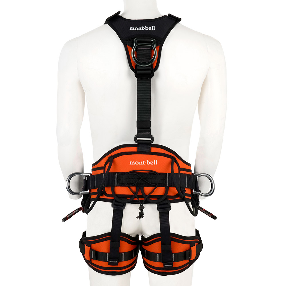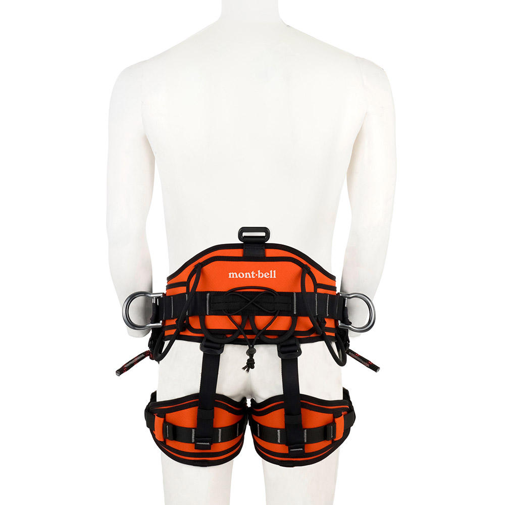 林業における特殊伐採で使用できるハーネス。D環を胴の左右に設けており、ワークポジショニングシステムで使用できます。チェーンソーやノコギリなどの重量のあるギア類を装着できるよう、パッドのサイズが大きく、厚みがあります。また樹上で体をねじるような動作でも安定するように、ブリッジ(ロープ)が側部のプレートに接続されています。別売りのロガーチェストハーネスと組み合わせることで6.75m以上の高所で使用する場合に必要な規格である墜落制止用器具のフルハーネス型として使用できます。それ以下の高度では、墜落制止用器具の胴ベルト型として使用できます。ギアラックを6つ配しており、スリングやカラビナを適宜装着できます。