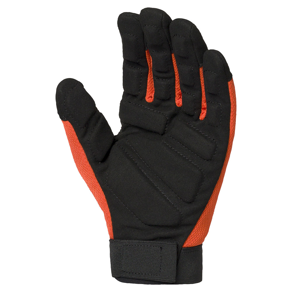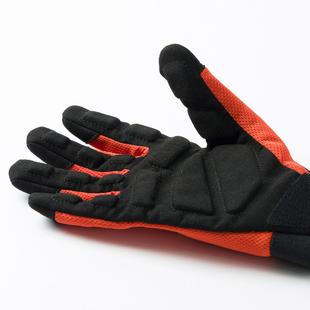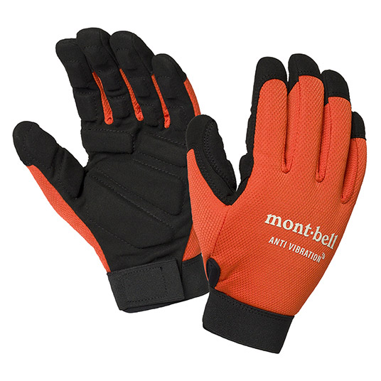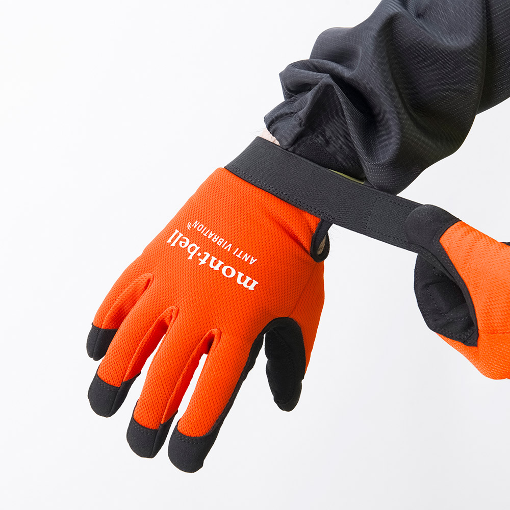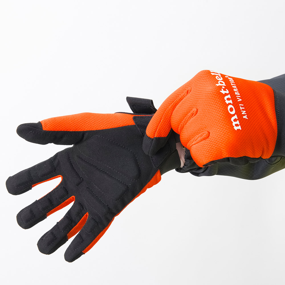 刈払機などの振動工具を使用する際に、振動を軽減するグローブ。振動軽減のためのフォームは、指の関節を避けた形に配置し、握りやすさに配慮しています。フィット感の高いゴム製の手首バンドはベルクロで着脱しやすい仕様です。