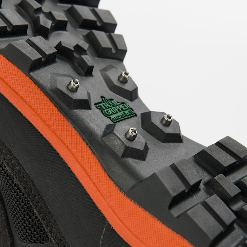 登山靴で培われた素材や機能を元に作られた林業作業用ブーツです。「BOA®フィットシステム」を使用し、ダイヤルを回すことで素早くフィット感の調節ができます。足首はベルクロで留める仕様です。アウトソールは独自開発のトレールグリッパー®と泥はけの良いソールパターンにより、高いグリップ力を発揮。濡れた岩肌や木道でも滑りにくく、さらに土踏まず部分にスパイクを備え、林業作業時などの安全面をサポートします。アッパー部分は世界最高レベルの防水透湿性素材ゴアテックスファブリクスを使用することで蒸れにくく、快適性を高めています。