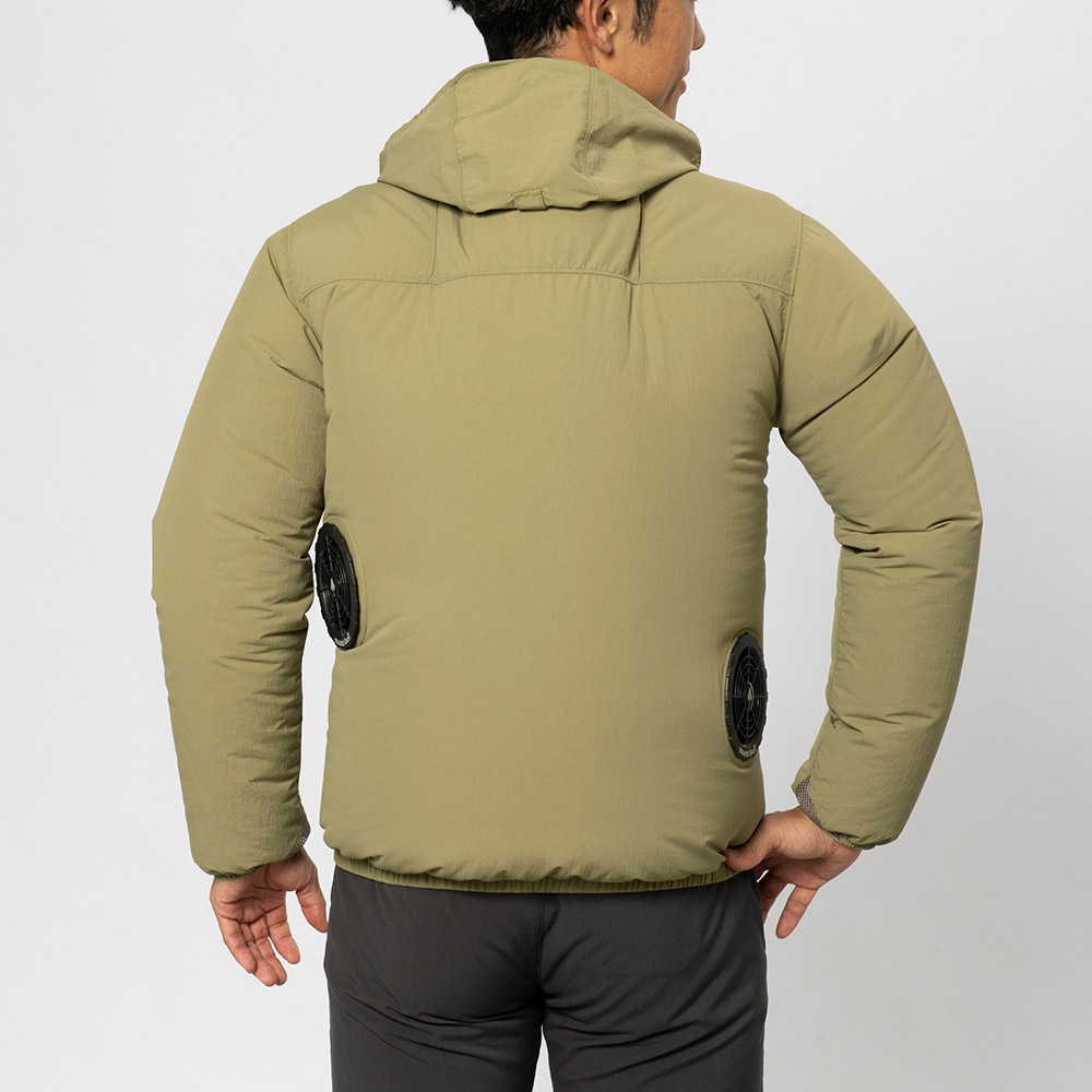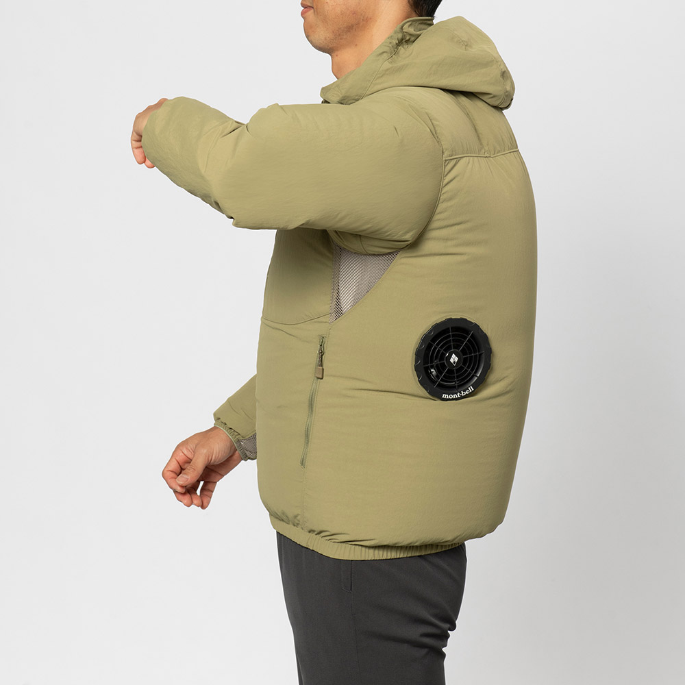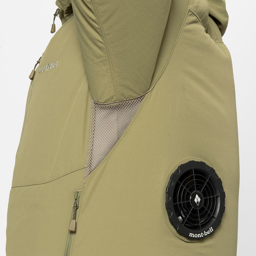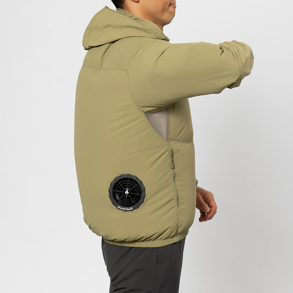 コットンのような風合いの生地の、暑い時季のアクティビティなどで活躍するファンとバッテリーが取り付けられるパーカです。ファンが汗の気化を促進し快適に過ごすことができます。左右非対称に取り付けられるファン(#1132244)は小型バックパックを背負った際にショルダーベルトと干渉しにくい位置にあります。取り外し可能なフードが付き、被ることで日差しを遮りながら頭部にも風が通るようになります。ファンを使用しないときには取り付け穴にベルクロで装着できるカバーが付属し、ウインドシェルとしても使用できます。