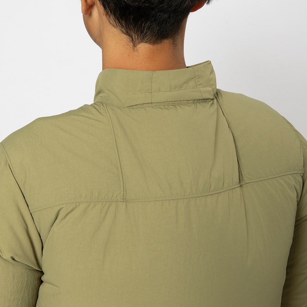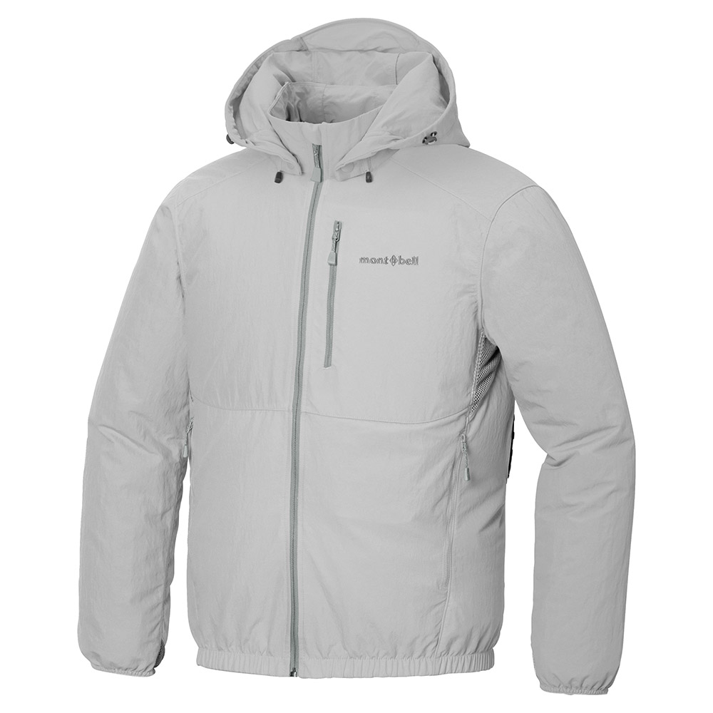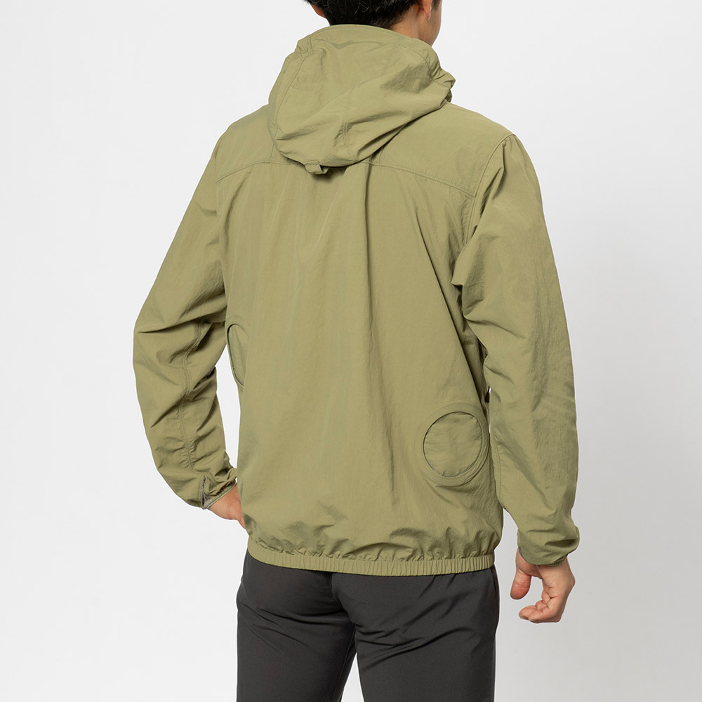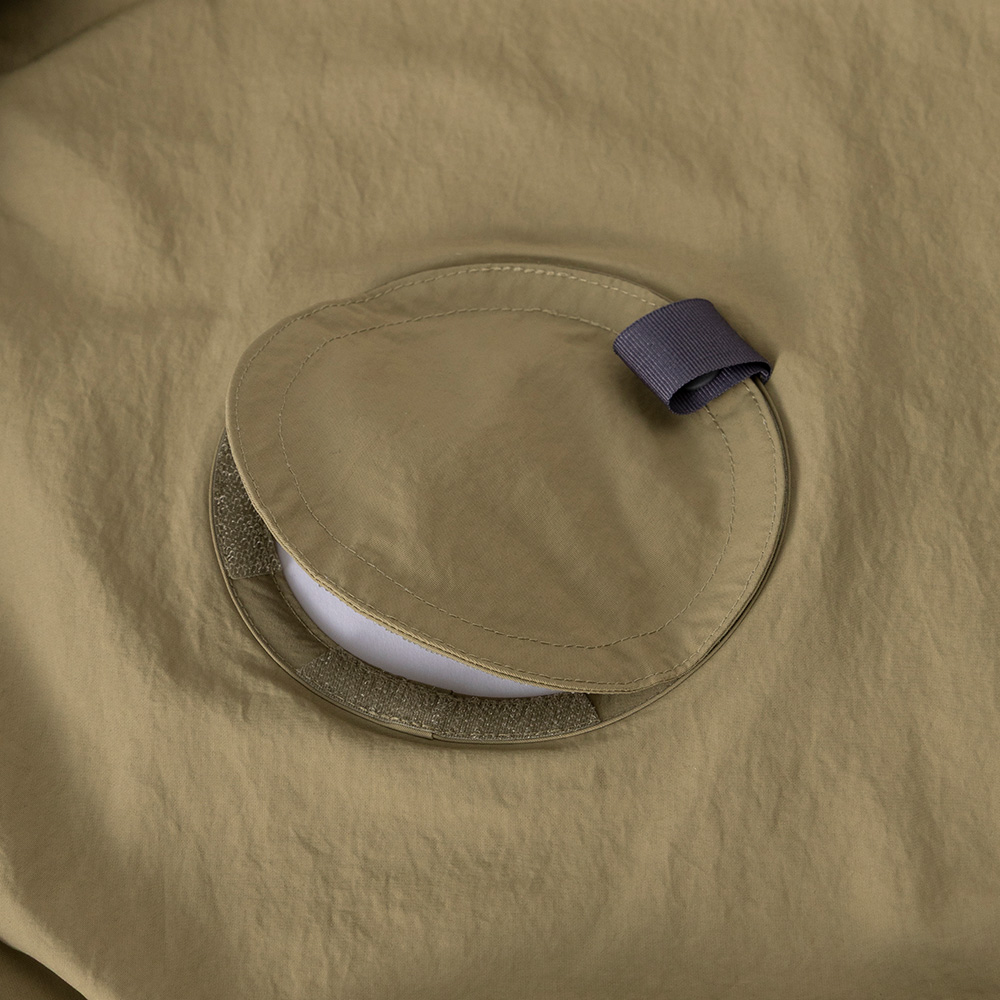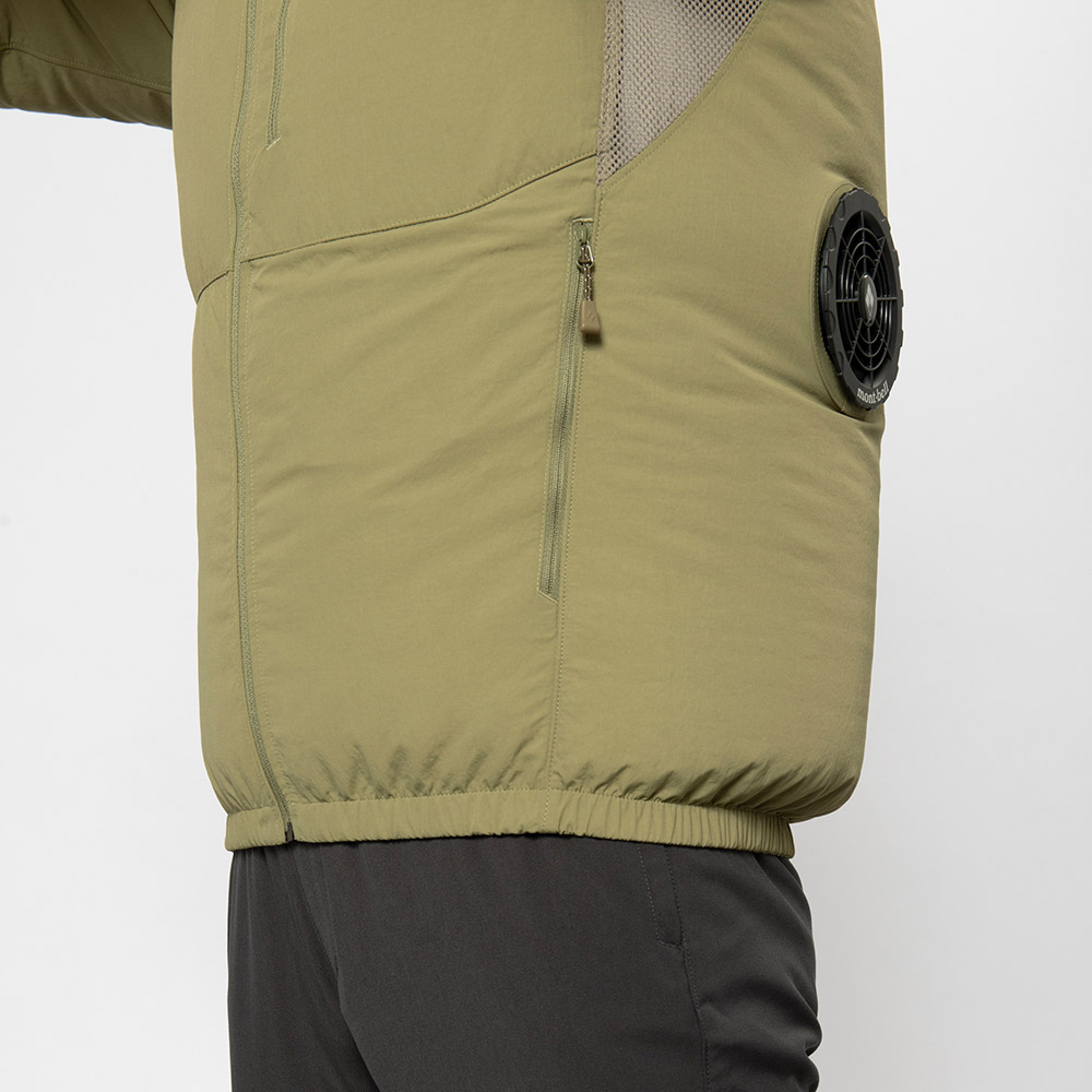 コットンのような風合いの生地の、暑い時季のアクティビティなどで活躍するファンとバッテリーが取り付けられるパーカです。ファンが汗の気化を促進し快適に過ごすことができます。左右非対称に取り付けられるファン(#1132244)は小型バックパックを背負った際にショルダーベルトと干渉しにくい位置にあります。取り外し可能なフードが付き、被ることで日差しを遮りながら頭部にも風が通るようになります。ファンを使用しないときには取り付け穴にベルクロで装着できるカバーが付属し、ウインドシェルとしても使用できます。