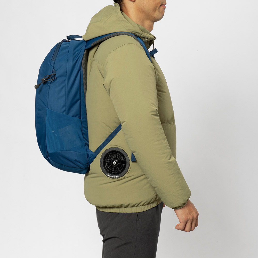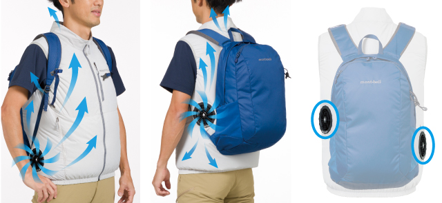 小型のバックパックを背負った時に、空気の流れを妨げにくい位置にファンを配置した独自の構造。左側のファンは背中側、右側のファンは体の前面と、異なる方向に風を生み、効果的に空気を送ることができます。