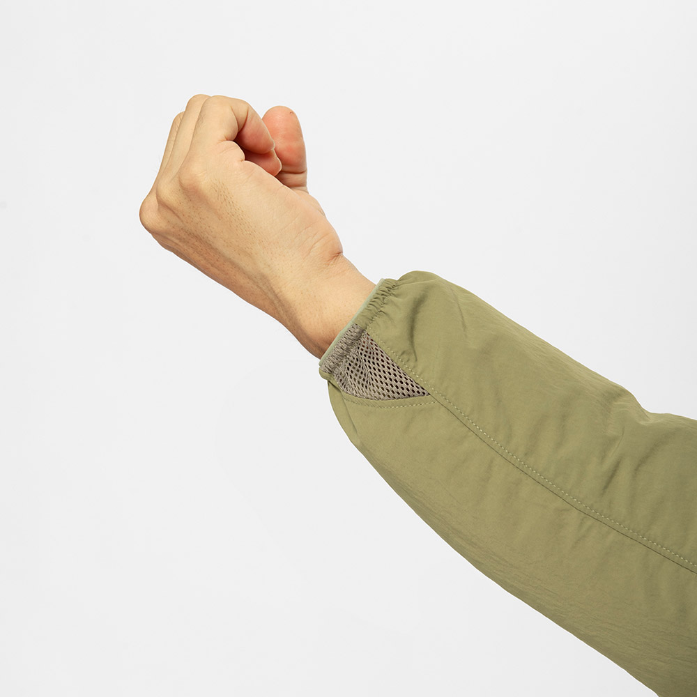 フードを被ることで日差しを遮りながら、頭部まで風が通ります。長袖の袖口にはメッシュのパーツがついており、袖口からも風が抜けます。