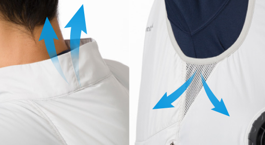 発汗が多い首裏と脇から空気を排出することで、効果的に涼しさを感じられます。