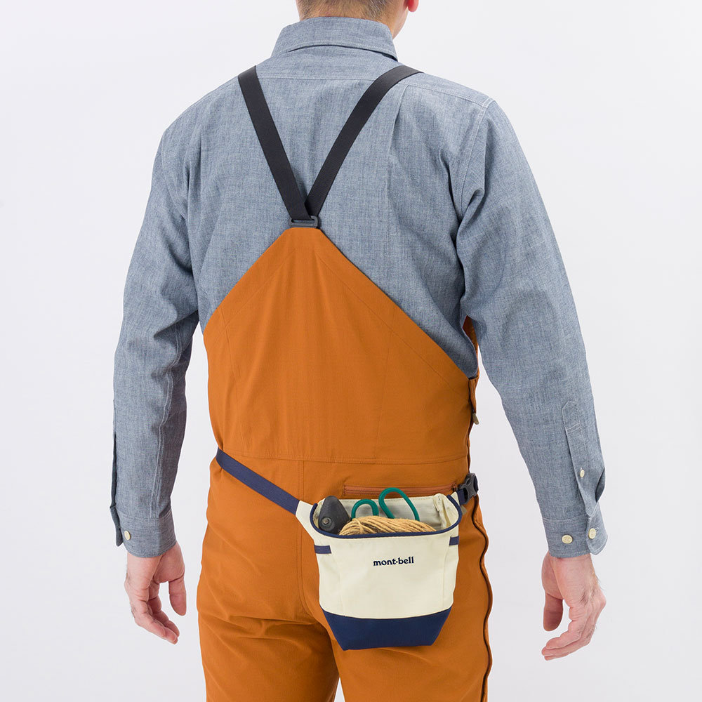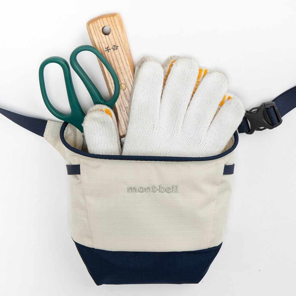 ガーデニングや家庭菜園で必要な道具を収納できる丈夫なウエストポーチです。スコップなどが出し入れしやすいメインポケットと、体側にはハサミを収納するポケットを設けています。開口部は道具を出し入れしやすいように芯材を入れ、内側底面とハサミポケットは丈夫な素材で補強しています。側面には蚊取り線香の携帯容器などがかけられるギアラック付きです。