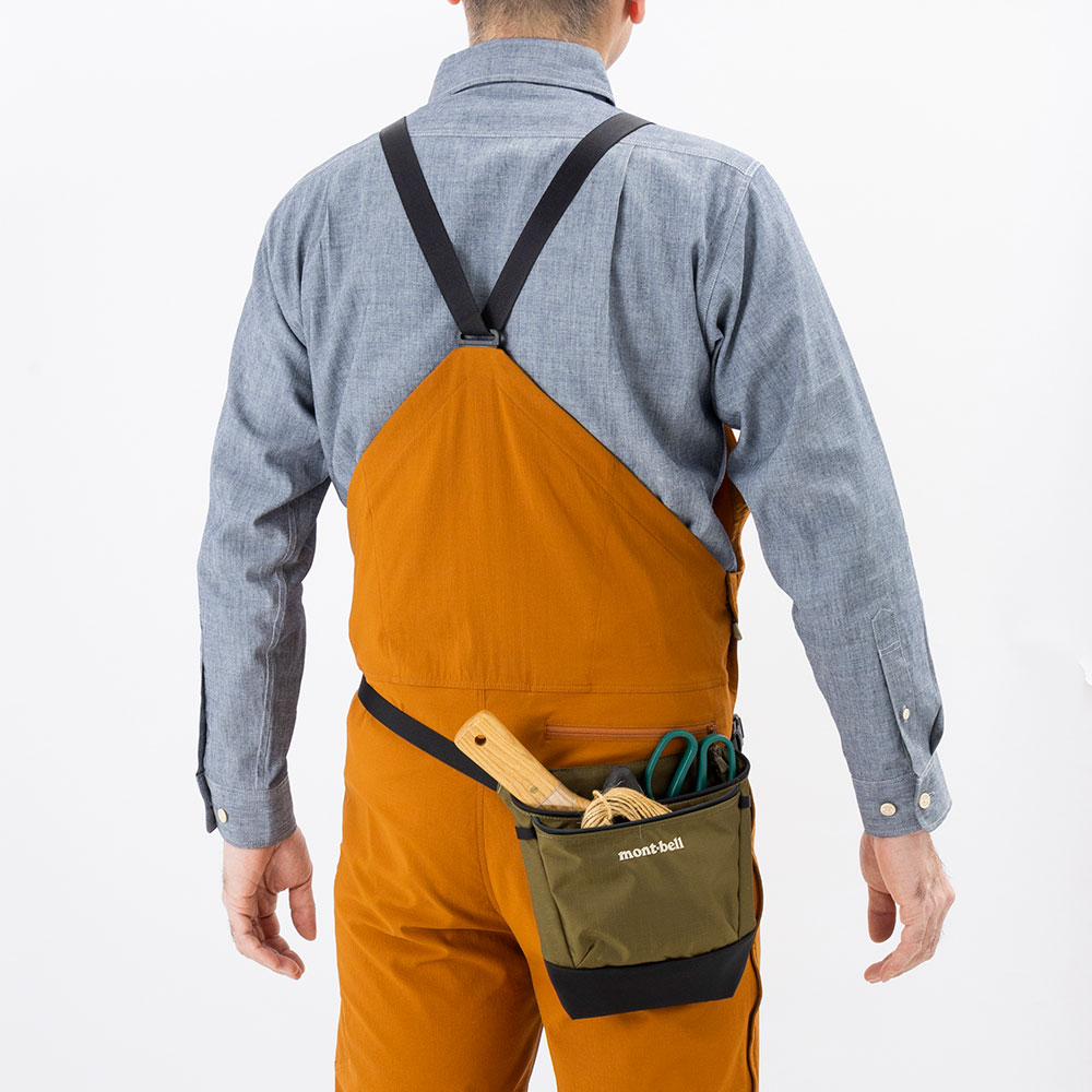 ガーデニングや家庭菜園で必要な道具を収納できる丈夫なウエストポーチです。スコップなどが出し入れしやすいメインポケットと、体側にはハサミを収納するポケットを設けています。折りたたみノコギリなどのやや長い道具類の収納を想定した大きさで、グローブなどが入るフロントポケットも設けています。開口部は道具を出し入れしやすいように芯材を入れ、内側底面とハサミポケットは丈夫な素材で補強しています。側面には蚊取り線香の携帯容器などがかけられるギアラック付きです。