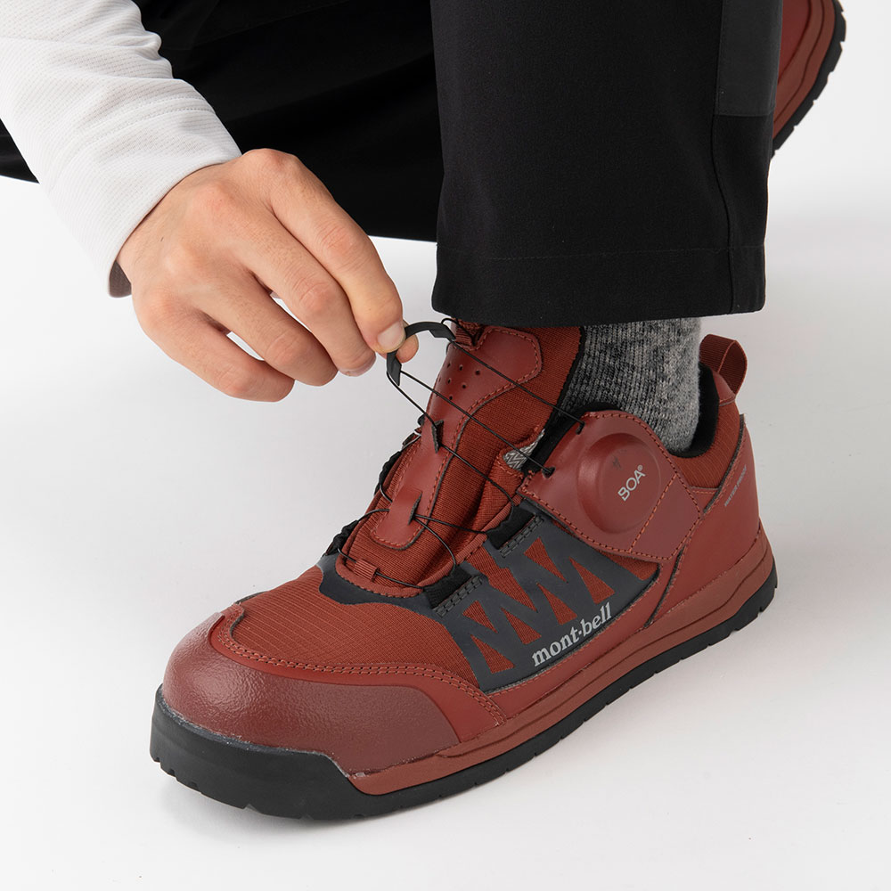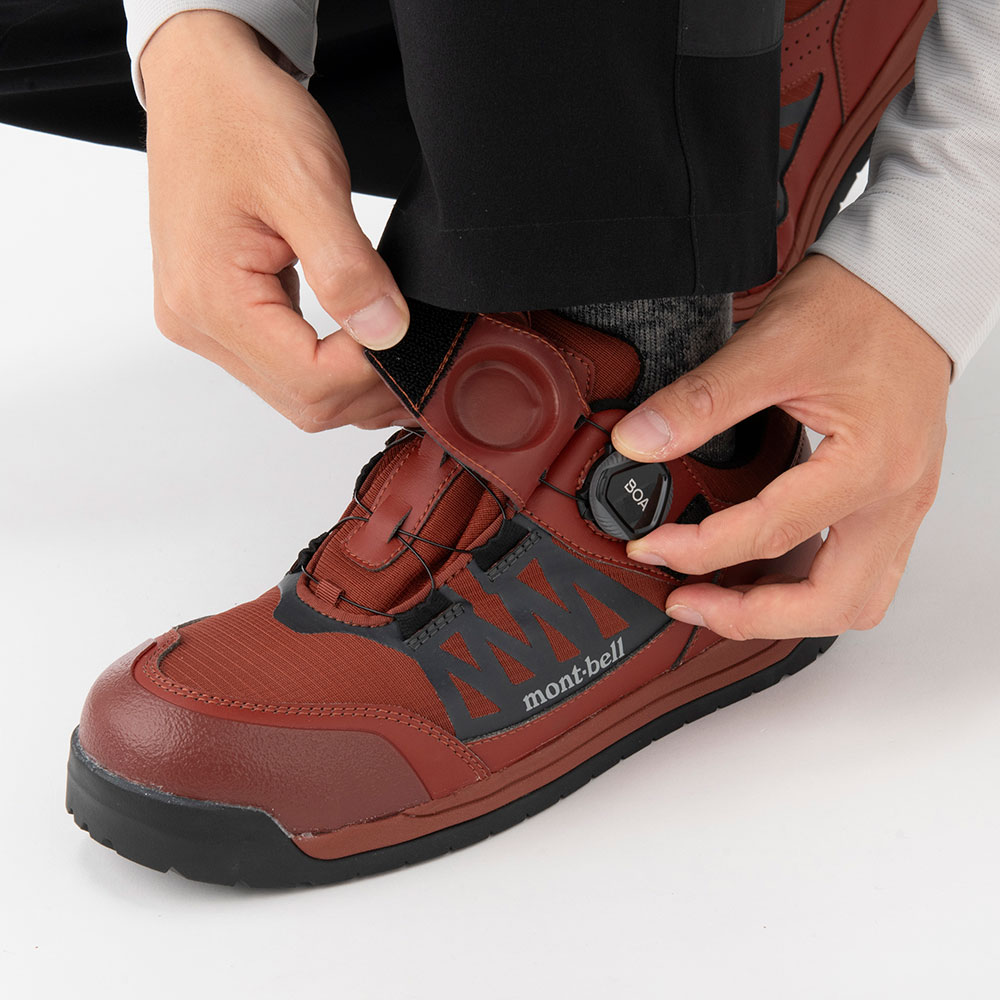 つま先に防護先芯が入っている作業用シューズです。林業での調査業務から、一般的な建設業でのワークシューズまで幅広い現場で使用できます。「BOA®フィットシステム」を使用し、ダイヤルを回すことで素早くフィット感の調節ができます。ソールには優れたグリップ力で路面を捉える高機能ソール「トレールグリッパー®」を使用しています。