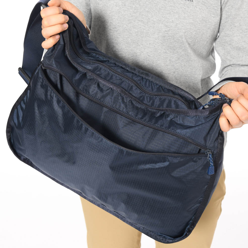 軽くて丈夫な素材を使用したシンプルなショルダーバッグです。使用しないときはコンパクトに折り畳むことができ、旅行時のサブバッグとしても適しています。