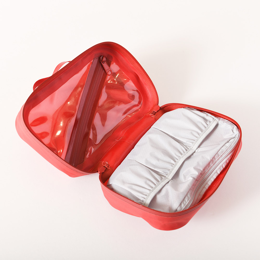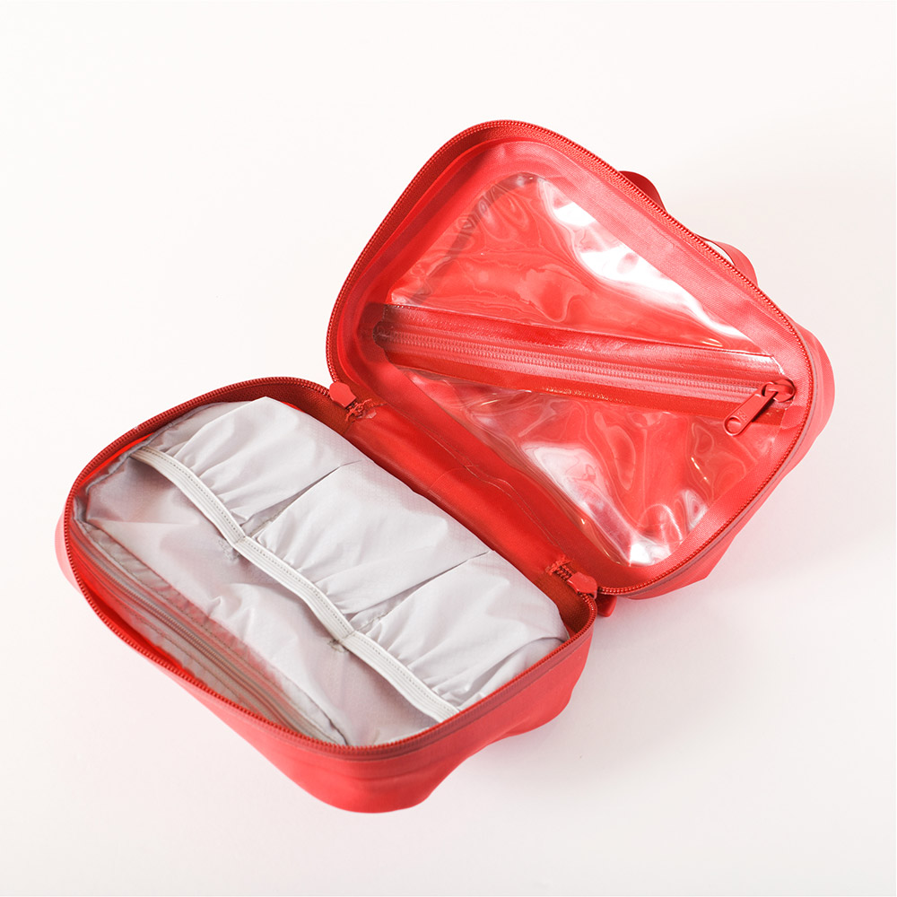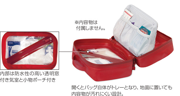 アウトドアでの万一に備えて、救急セットを機能的に収納できる防水性の高いバッグです。ジッパーを開けるとバッグ自体がトレーとなり、内容物を汚さず地面において素早い処置が可能。内側には仕分けして収納できるポケットやインナーポーチを備えています。※完全防水ではありません。