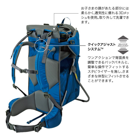 生後9ヶ月くらいから3歳くらい(身長約90cm)までのお子さまを背負うことが可能な自立式・軽量キャリアです。転落を防止するハーネスやパッドを備え、お子さまの安全性を確保。座部の表面にはソフトな肌触りの3Dメッシュ、内部には通気性に優れたスポンジを使用し、快適性を高めています。性別や体格を問わず、お父さんとお母さんで共用できる背面長の調節システムや、お子さまを乗せやすいフルオープン仕様など、使い勝手を高める機能を搭載。行動しながら水分補給が可能なトレールウォーターパック(別売)が装着可能。