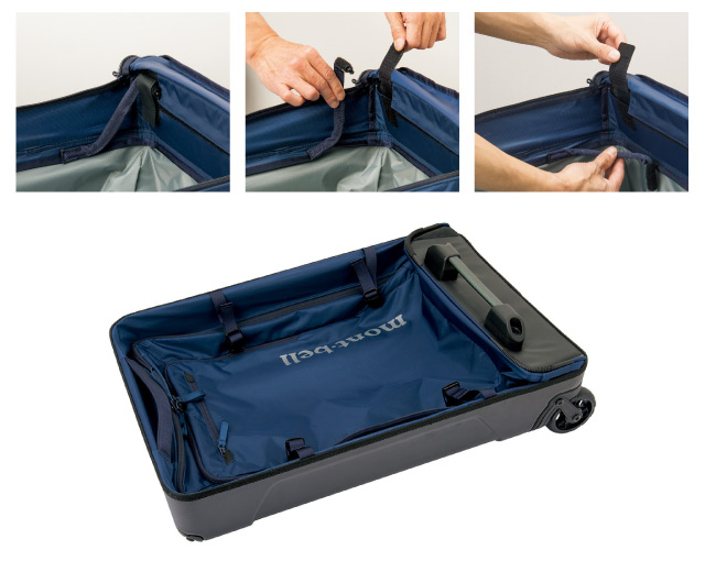 高い強度と軽量性を両立したキャスター付きトラベルバッグです。ハンドル、キャスターと一体になったバックパネルは、優れた強度を備えています。剛性の高いバックパネルに、軽量で耐久性に優れた生地を組み合わせた構造です。荷物が多い時にも安定して引くことができ、手の負担を軽減します。使用しない時はコンパクトに折り畳むことができる仕様です(中身がない時に厚みを薄くすることができます)。
