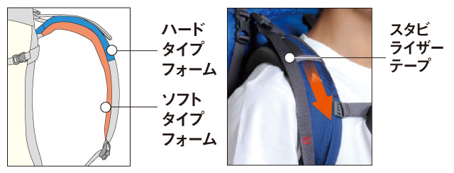 内側にソフト、外側にハードタイプのフォームを内蔵しています。脇・肩・背中へと包み込むように密着することでぶれを防ぎ荷重を分散。大容量を感じさせない絶妙な荷重バランスを実現しています。モデルによってスタビライザーテープでフィット感を調整できます。