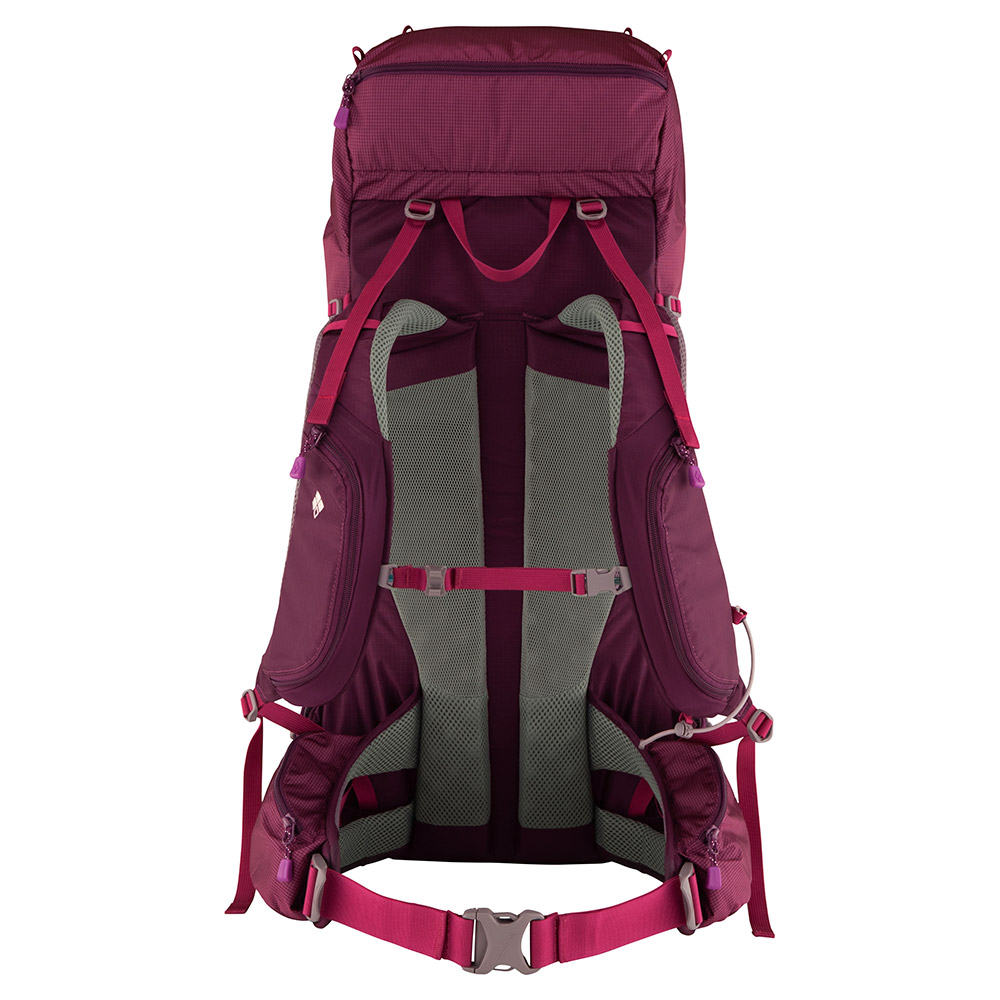 大小さまざまなポケットや本体下部へのアクセスファスナーを装備し、収納力に優れる1気室の中型パックの女性用モデルです。1泊2日程度の小屋泊まり登山に適した容量です。専用パックカバー付き。