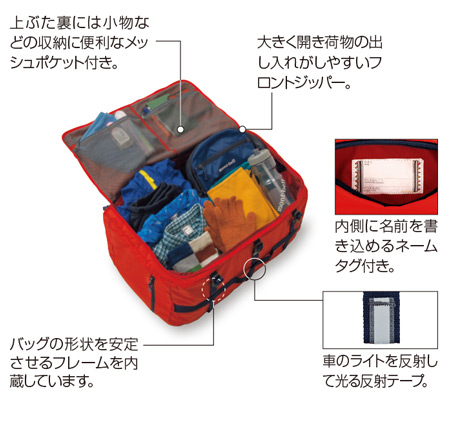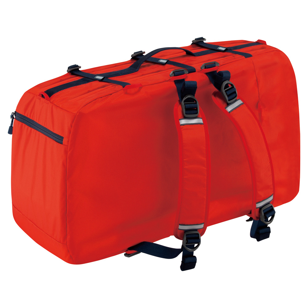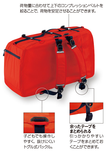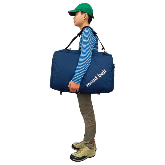 2泊3日程度の林間学校や修学旅行に最適な容量のダッフルバッグです。2つのショルダーベルトを付け替えることで、用途に合わせて「肩にかける」「横に背負う」「縦に背負う」の3通りの使い方ができます。身長に合わせて背負う方向を変えることで、幅広い年代で使用できます。