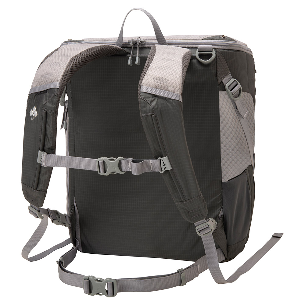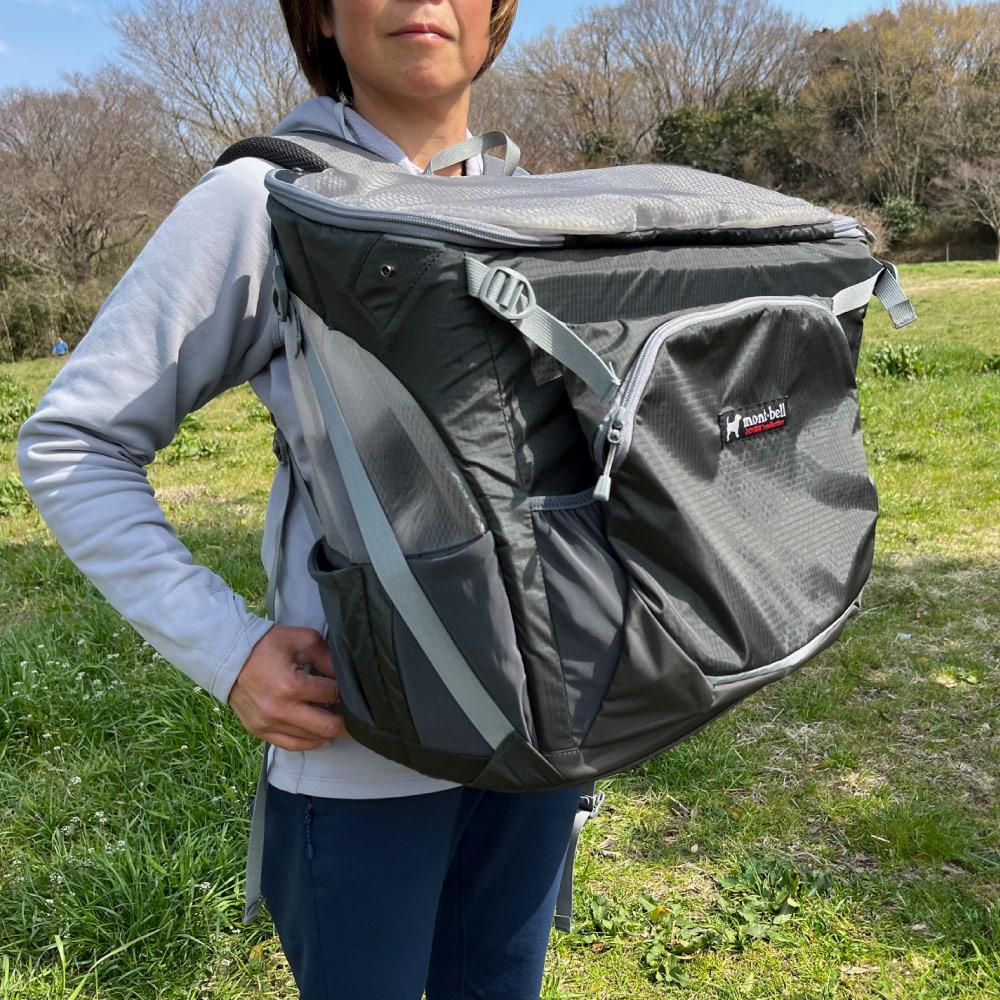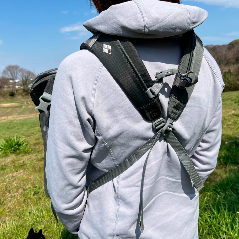 ソフトなタッチで通気性に優れたパットを採用。使用しない時は背面に収納できます。背負った時の安定感を高めるチェストストラップ付きです。