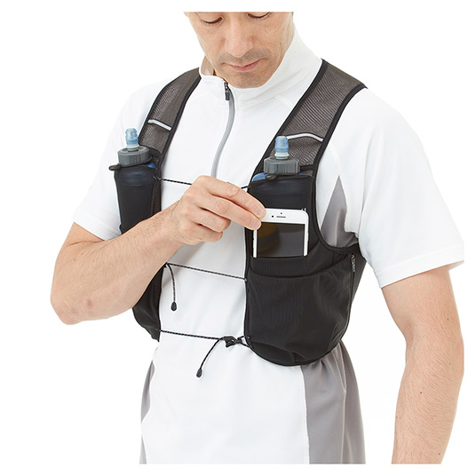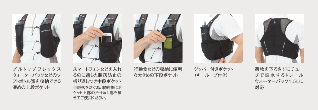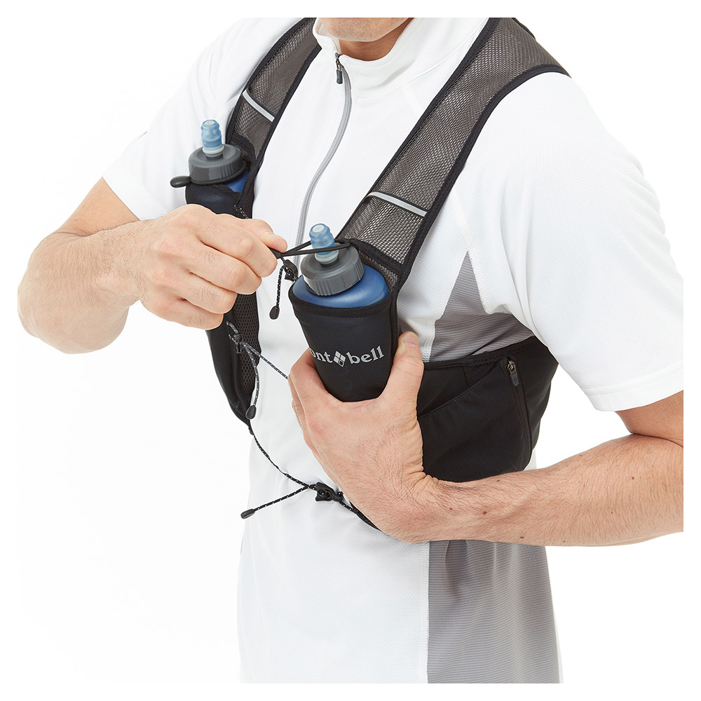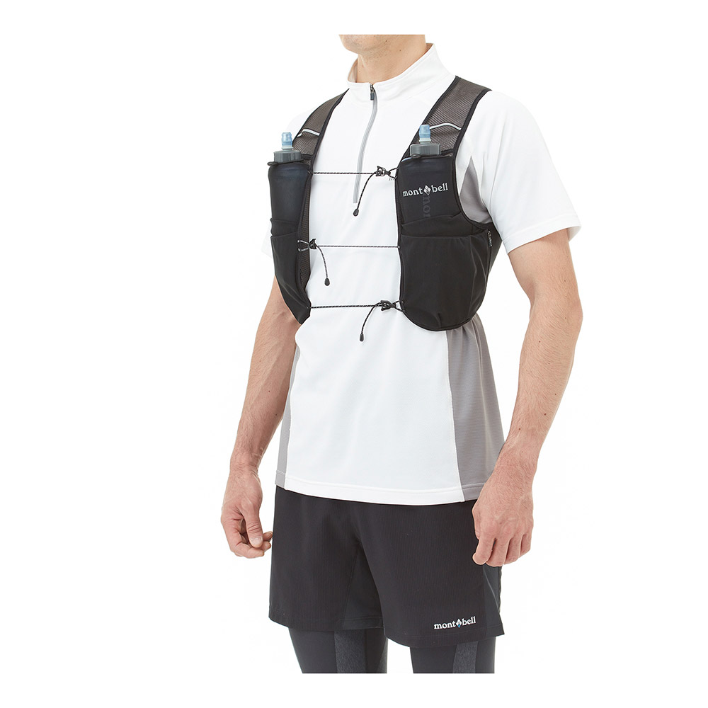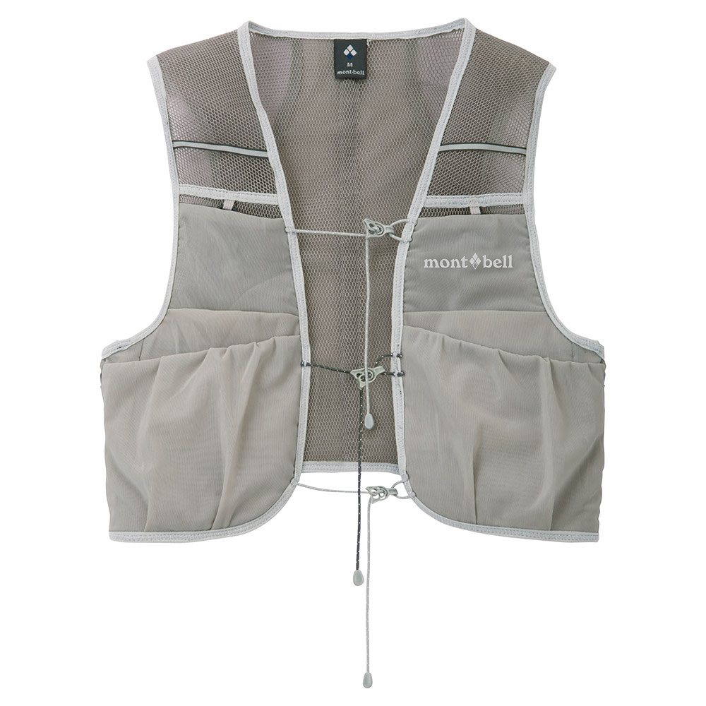 ストレッチ性に優れるメッシュ素材の軽量ベストです。ソフトボトルを装着できるポケットなど、薄手ながら収納力に優れ、別売の「トレールウォーターパック 1.5L」にも対応しています。必要最小限の装備でハイキングやトレイルランニングを楽しまれる方にオススメです。