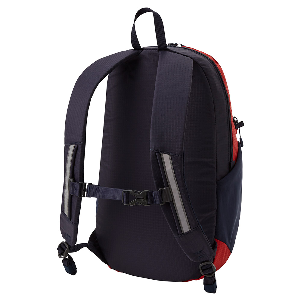 日帰りハイキングから日常使いまで活躍するシンプルな形状のバックパックです。視認性を高める反射材や、力が加わると外れるチェストサポートなど、子どもの安全に配慮した機能を備えています。