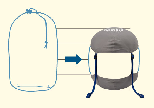 コンパクトなモンベルのスリーピングバッグをさらに圧縮し、少ないスペースでバックパックなどに収納するための便利なアイテムです。