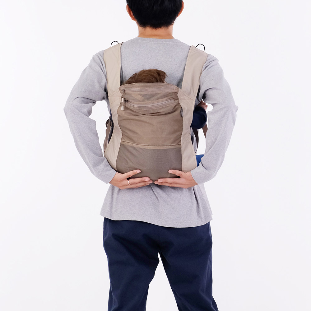 軽量・コンパクトに収納でき、携行に便利なポケッタブル仕様のベビーキャリアです。「抱っこ」と「おんぶ」の2通りの使い方ができ、荷重をウエストで支える疲れにくい設計です。通気性に優れる素材を使用し、熱がこもりにくくなっています。ハイキングやお出かけなどで、歩き疲れた子どもの抱っこに適しています。子どもを降ろした後は本体をまとめてウエストベルトに固定しておけるので、足もとに垂れ下がらず歩行などの妨げにならない仕様です。付ける人の体格に応じて、高さを調節できるチェストサポート付きで、どなたでも快適に装着できます。汚れたら洗濯機で丸洗いできます。