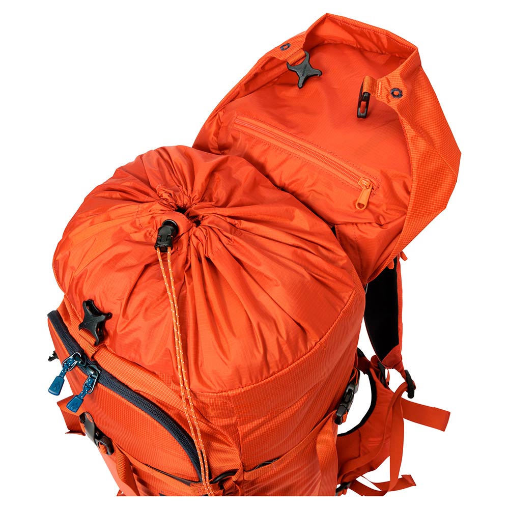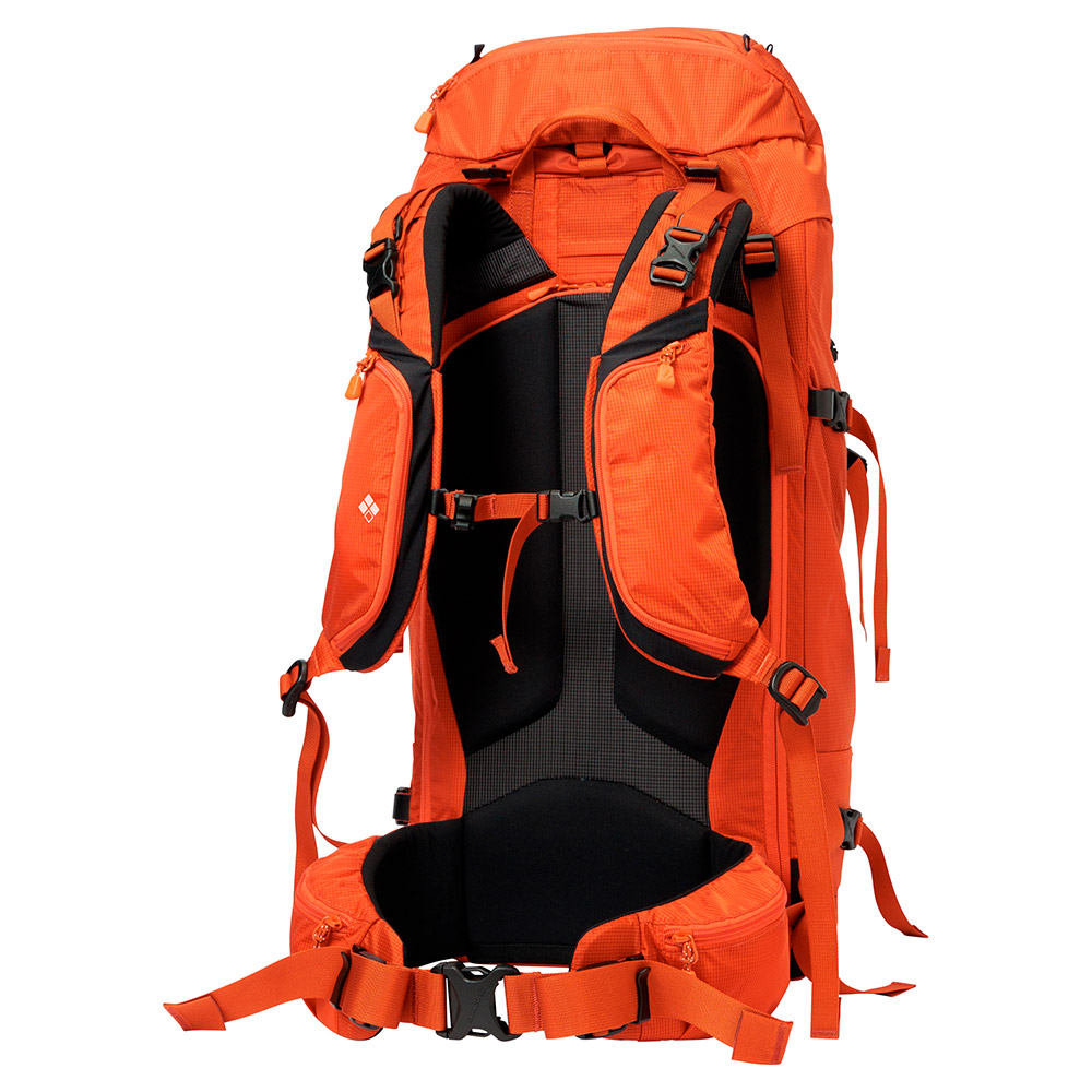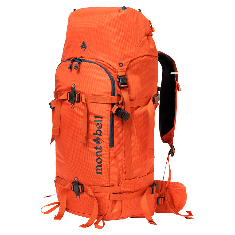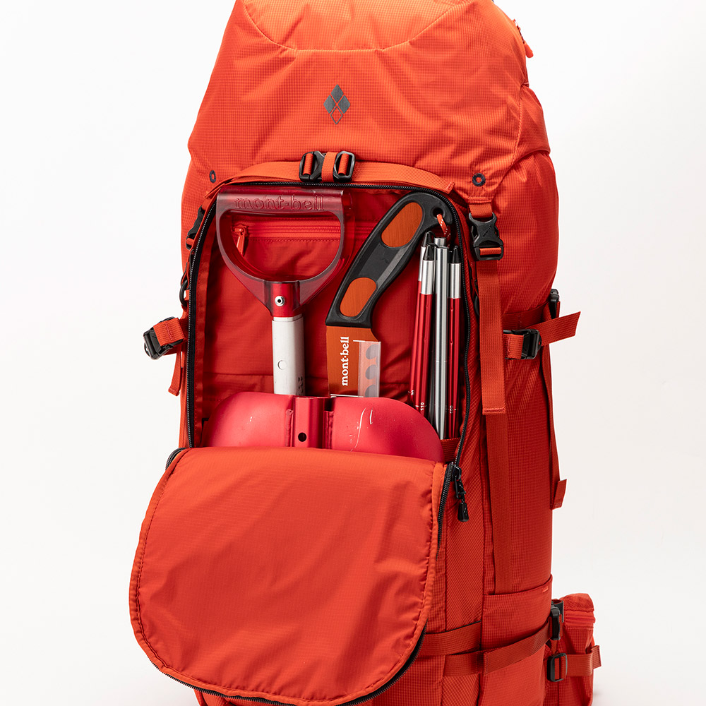 スキーやスノーボード、スノーシューなどのスノーアクティビティに必要なギアや装備を機能的に携行できるパックです。スキー板やスノーボードを装着して歩行する際に揺れにくく優れた安定性を実現。滑走時も邪魔になりにくい薄型デザインで、バックカントリーツアーなどに活躍します。ツアーに必要な個人装備に加え、リーダーが携行するロープなどの共同装備の収納に対応するサイズのモデルです。マルチデイツアーにも適しています。