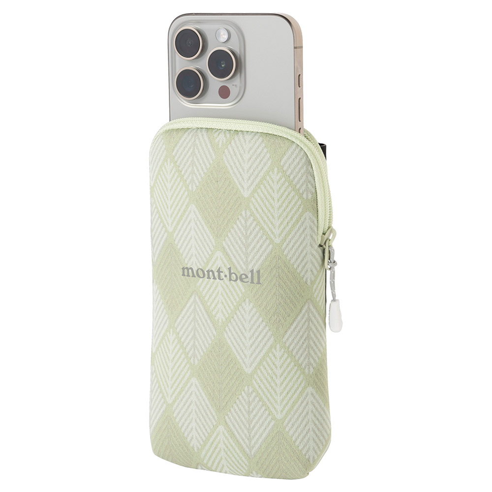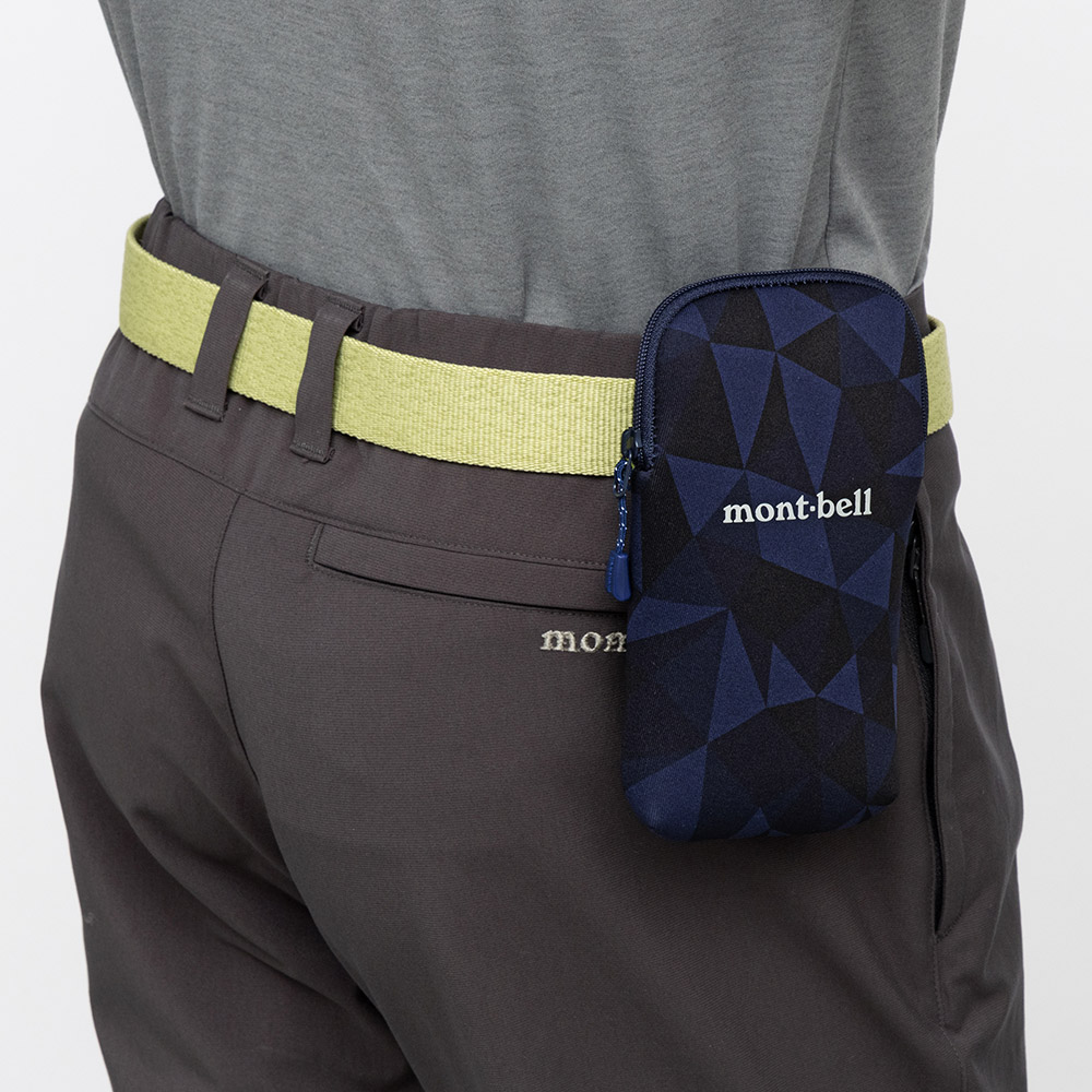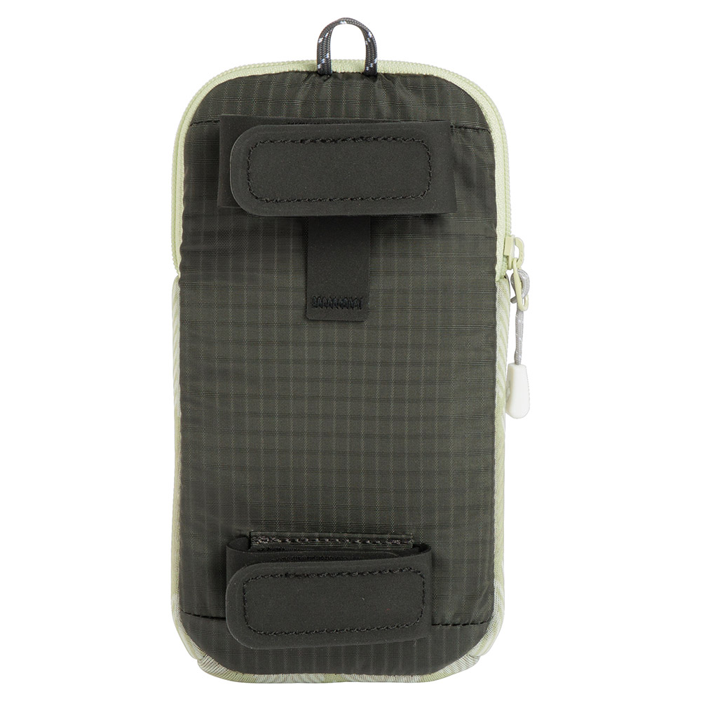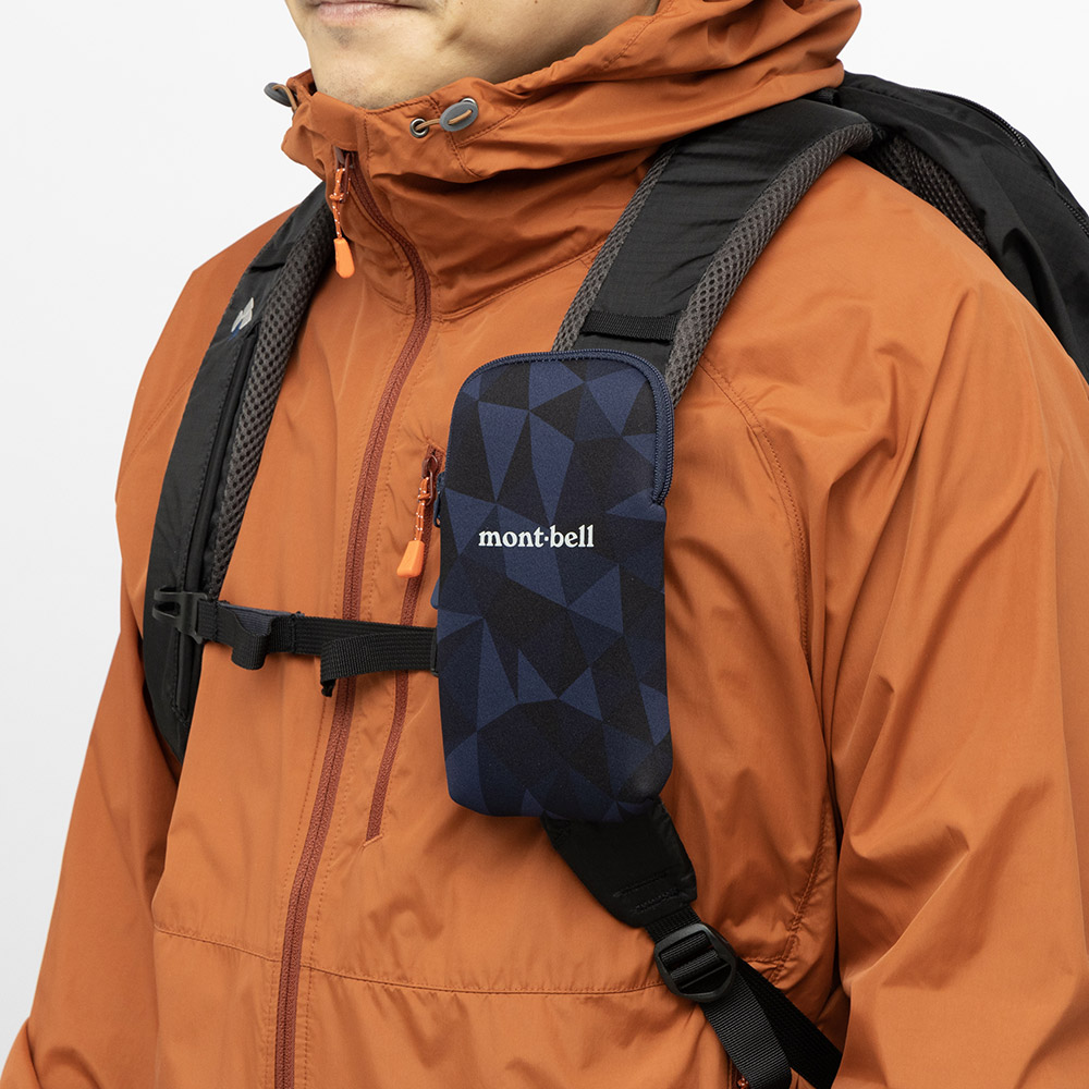 バックパックのショルダーハーネスや、ベルト等に取り付けられるスマートフォンポーチです。取り外し可能な背面のバンドは上下2か所で固定でき、行動中にバタつきにくくなっています。本体はクッション性と伸縮性を備えた素材を使用。内側にスマートフォンのリーシュコード等を通すループが付いています。