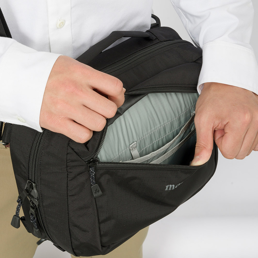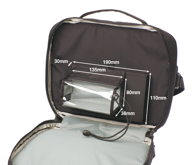補助人工心臓システム専用のキャリングバッグです。装着している患者さんや医療関係者からの意見を反映し、機能的でスマートな、持ち運びのしやすいデザインになっています。取り外し可能なウエストベルトと、ショルダーストラップを付け替えることで肩掛けと背負い、2通りの使い方が可能です。ケーブルの出入り口はジッパースライダーの位置に応じて自由に設定できます。内部はコントローラーのパネルが見えるよう、透明シートになっています。