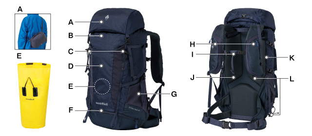 【特長】サイドストラップ / 調節可能なトップリッド / サイドストラップ / ワンドポケット / ショルダーポケット(左右) / チェストサポート / ポールループ / ロールアップシステム / トレールウォーターパック対応 / 水の浸入を防ぐアクアバリアサック / 3Dフィットステー / エアスルーバックパネル(ファブリックタイプ) / スーパーフィットショルダーハーネス / アナトミカル・ヒップベルト