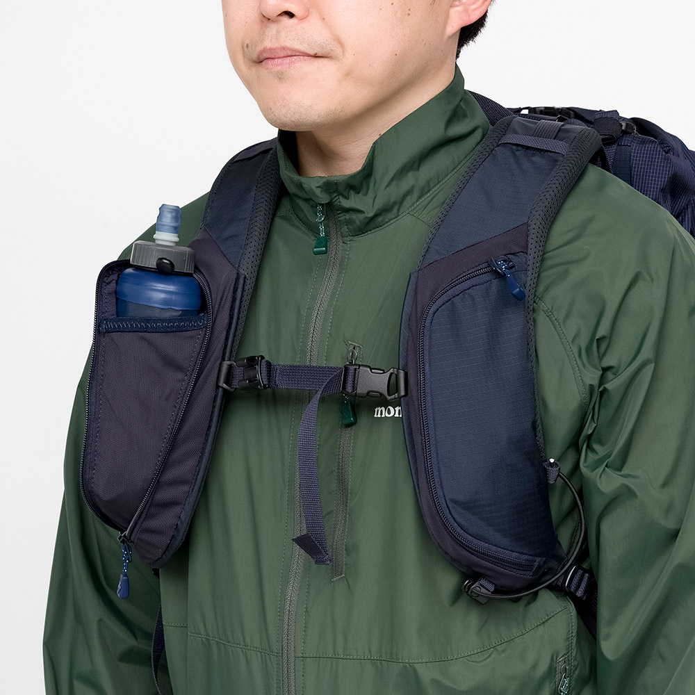 バックパックを下ろさず水分補給できるトレールウォーターパックの装着が可能。チューブは本体背面上部の穴から取り出せ、ショルダーハーネスに留められます。