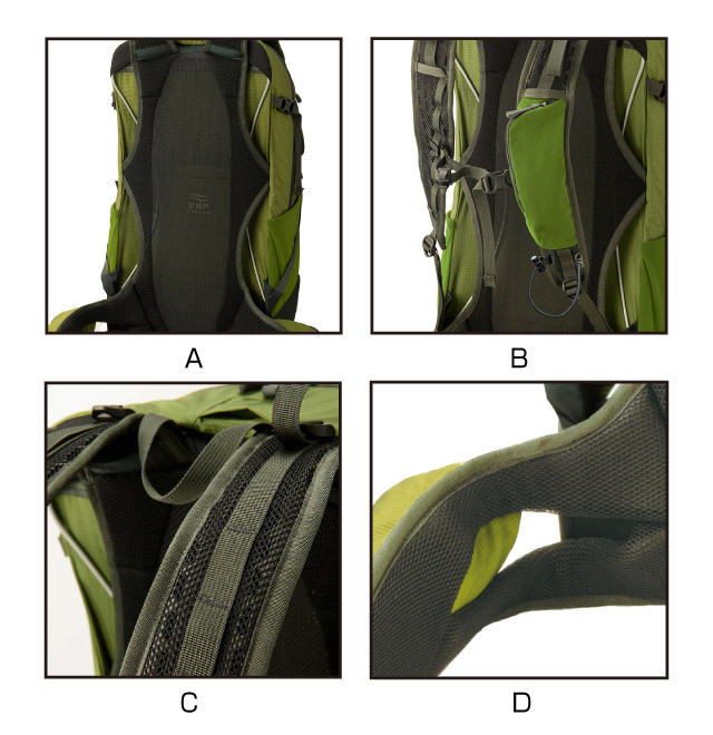 A:バックパネルと本体の間の空間により蒸れを軽減(V.B.P.システム)