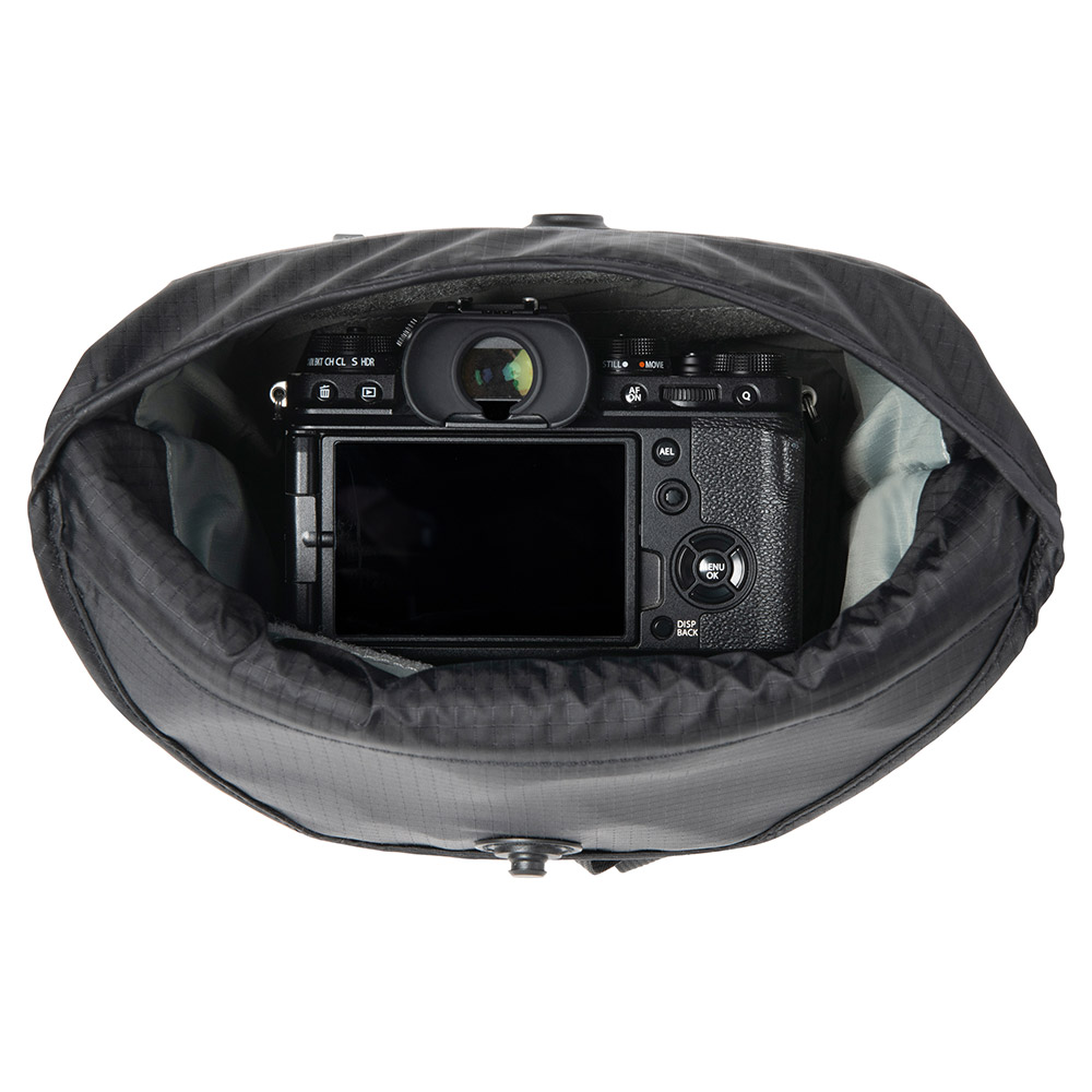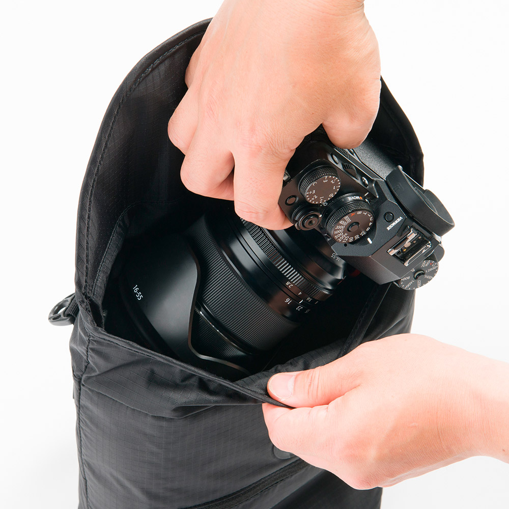 トレッキングから普段使いまで、さまざまな場面で機能的に活躍する、超軽量・カメラバッグです。フラップを開くだけのワンアクションで素早くアクセスができます。ショルダーベルト、ウエストベルトは必要に応じて取り外しが可能。バッグ全体には、衝撃から守る薄くやわらかな緩衝材が封入されており、そのままバックパックなどの中に入れてインナーバッグとしてもお使いいただけます。ベルクロにより取り外しが可能な付属の仕切りを使い、カメラやレンズのサイズに合わせてバッグ内のレイアウト変更が可能です。