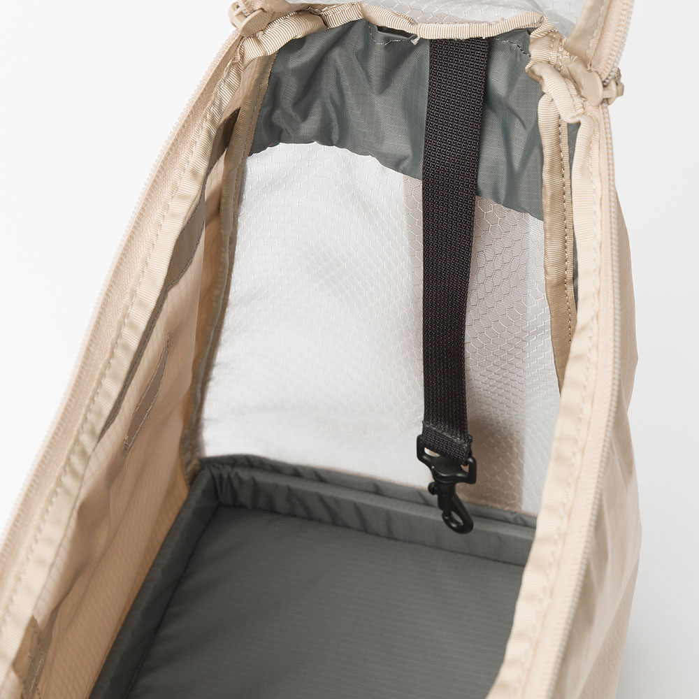 愛犬が疲れた時や、電車やバスで移動の際に便利なキャリーバッグです。体重約8kgまで対応するサイズです。使用しないときはコンパクトに折り畳むことができ、愛犬とお出かけする際に常時携行していただけます。底にはしっかりとしたパレットが入っており愛犬の体勢が安定します。パレットは取り外して洗うことができます。四隅に縫い込んだ芯材により自立する仕様。内側に飛び出し防止用のリーシュを設けています。