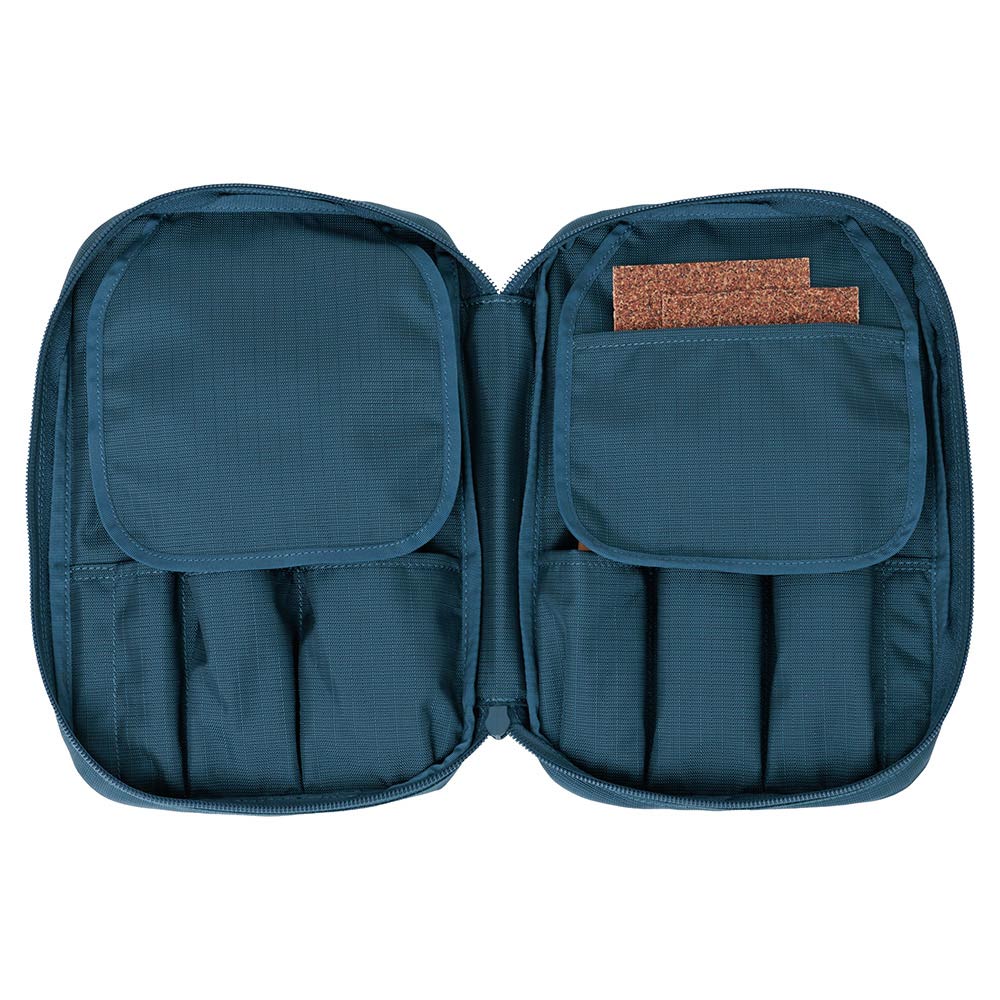 木工作業に必要な刃物や定規、ペンなどを収納するためのポーチです。ファスナーを全開し、見開くことで道具の出し入れがしやすく、閉じた際には刃物同士が重なり合わないよう、カバーが配置されています。全体にフォームを入れることで道具を保護し、しっかりとした形状なのでカバンへの出し入れもしやすくなっています。側面にはハンドルとキーホルダー用のDリングを配置しています。
