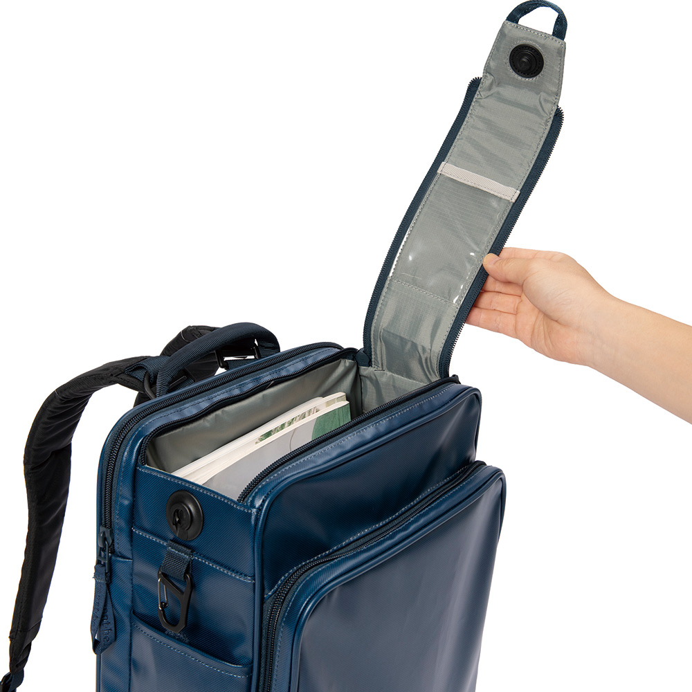 B.PCやタブレットは背面側のポケットにぴったり収納。クッション付き。