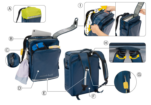 I.ハンドルと左右のタブ(ループ)を使って簡単に開閉できます。物の出し入れがしやすい大開口です。