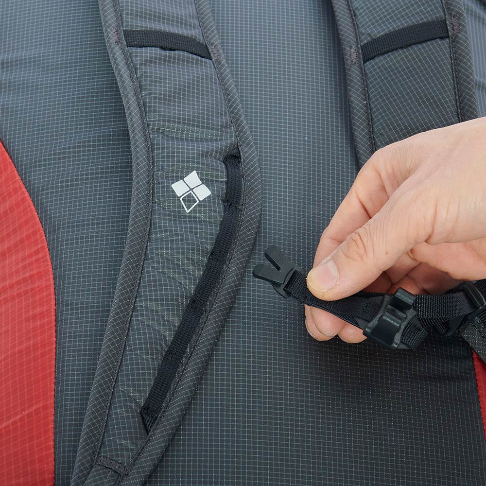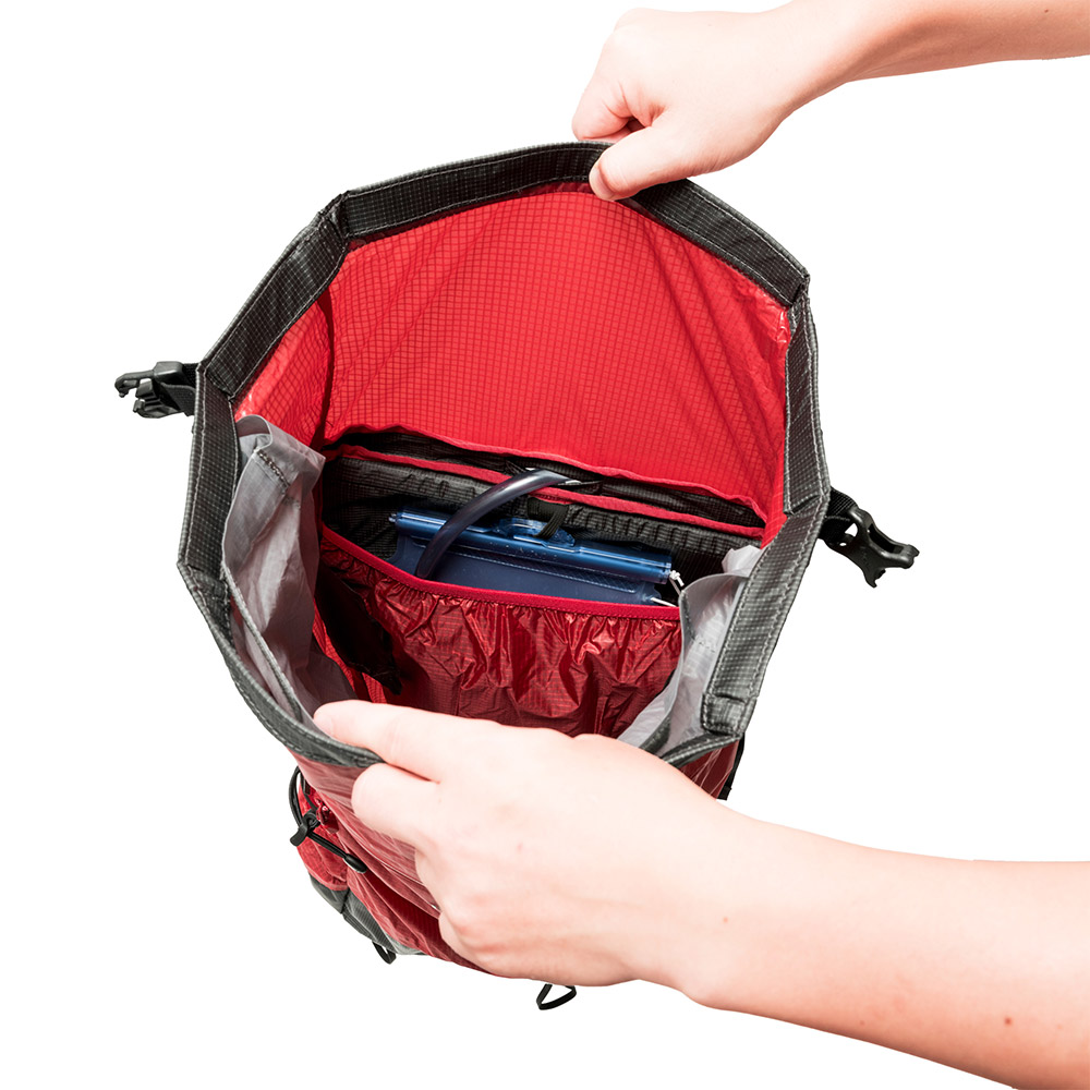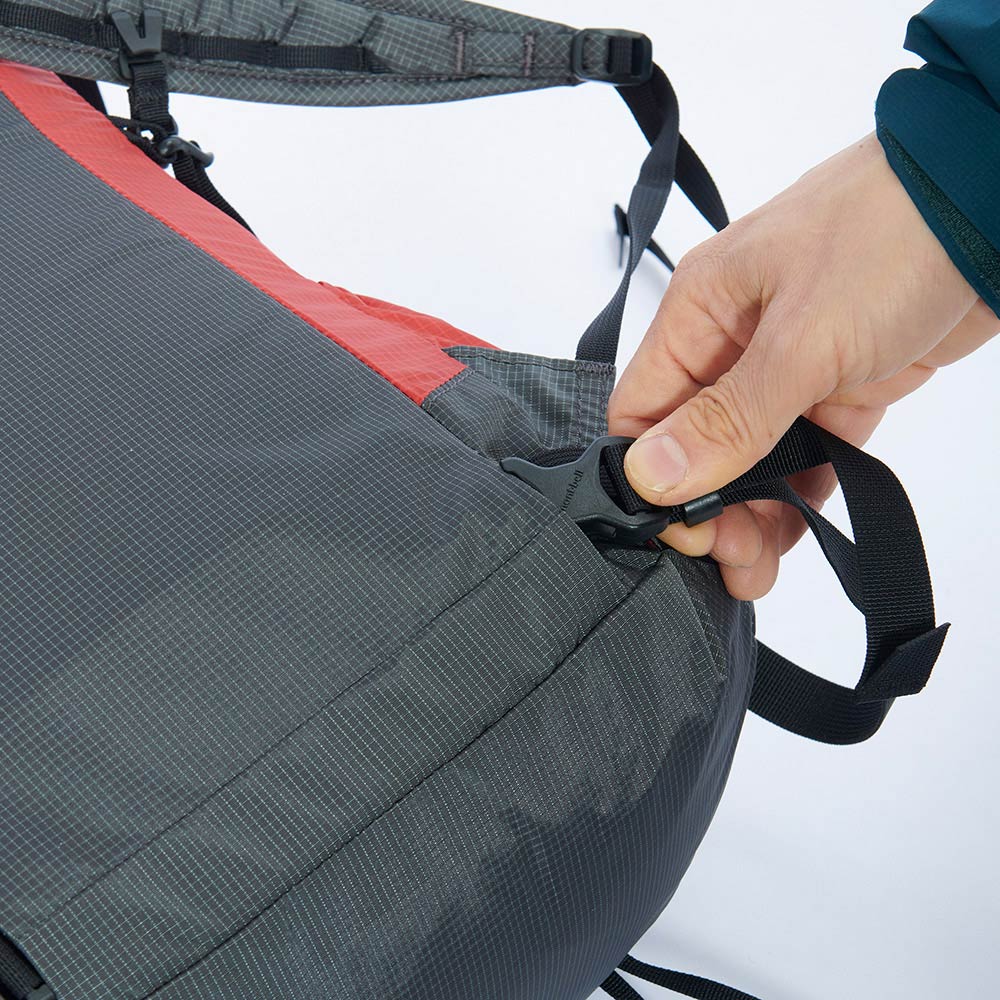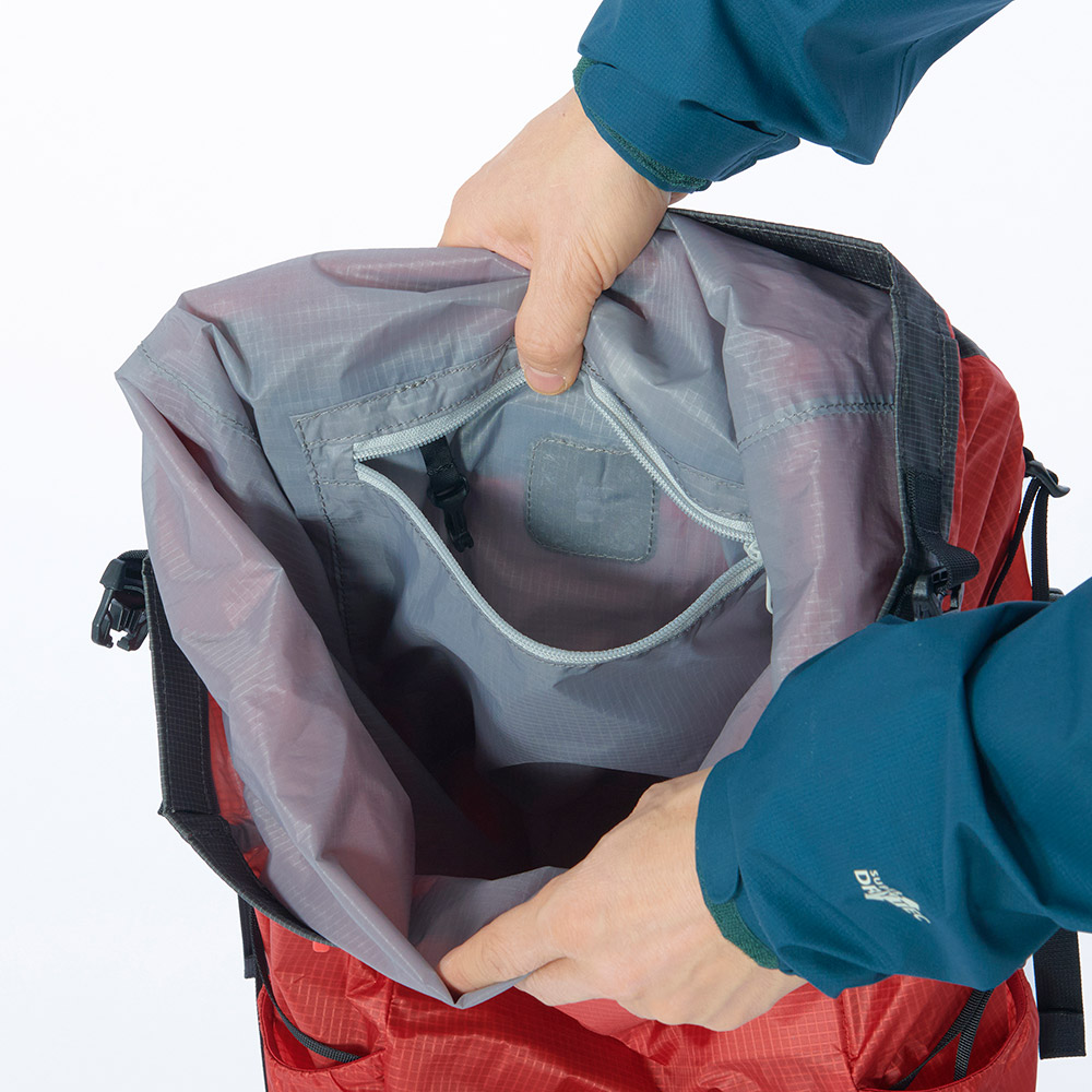 操作性・防水性に優れるロールアップシステムを搭載したシンプルな軽量バックパックです。本体生地には軽量性と強度を両立した素材を使用。防水素材を使用した内袋、アクアバリアサックを備え、高い防水性を発揮します。開口部はサイドと上部のどちらのバックルでも留められる仕様です。収納可能なウエストベルト、着脱可能なチェストサポートと背面パッドを備えています。