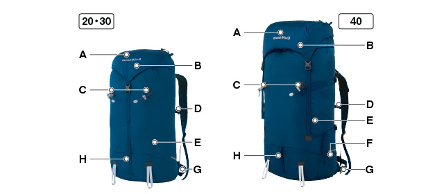 F: ポールなどの側面取り付けに便利なポケット(40L)