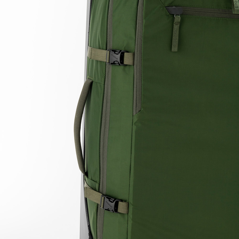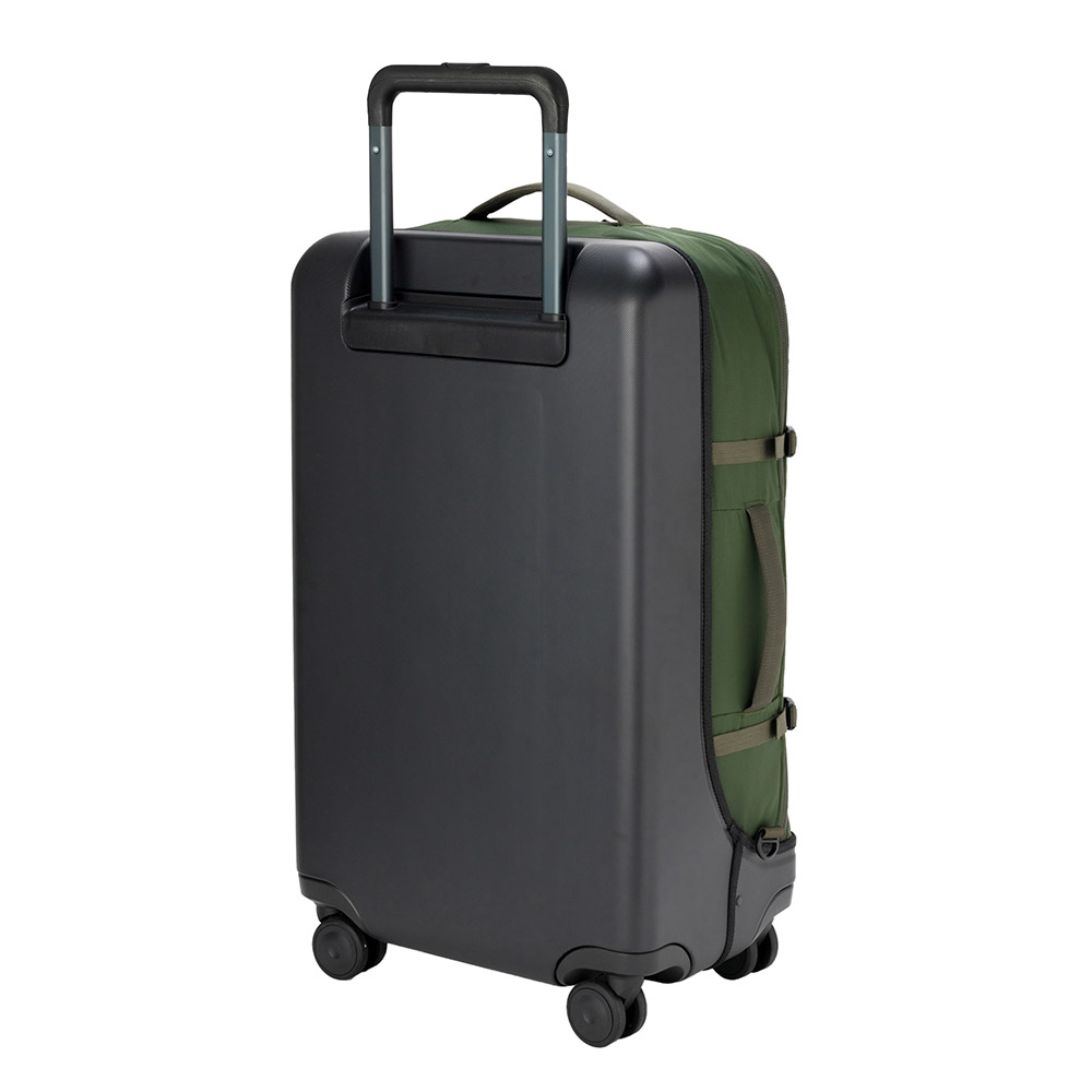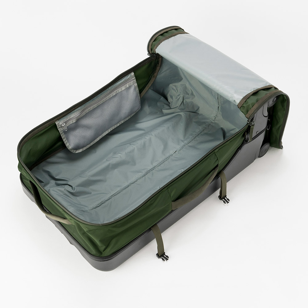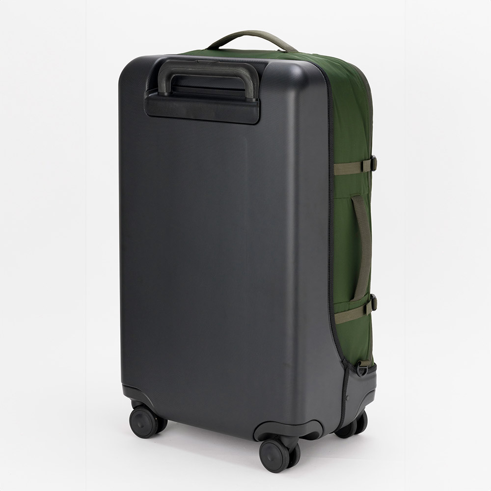 軽量ながら高い強度を備え、重い荷物を入れても安定して引くことができる、4輪のキャスター付きトラベルバッグです。剛性の高いバックパネルに、軽量で耐久性に優れた生地を組み合わせた構造です。駅や空港など、人が多い場所でも身体に近い位置で運ぶことができ、スペースを取りません。別売りのウィーリーバッグ ショルダーハーネスを取り付けて背負うこともできます。