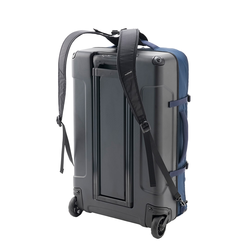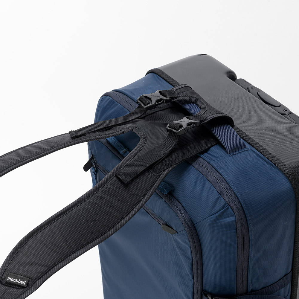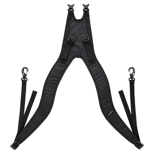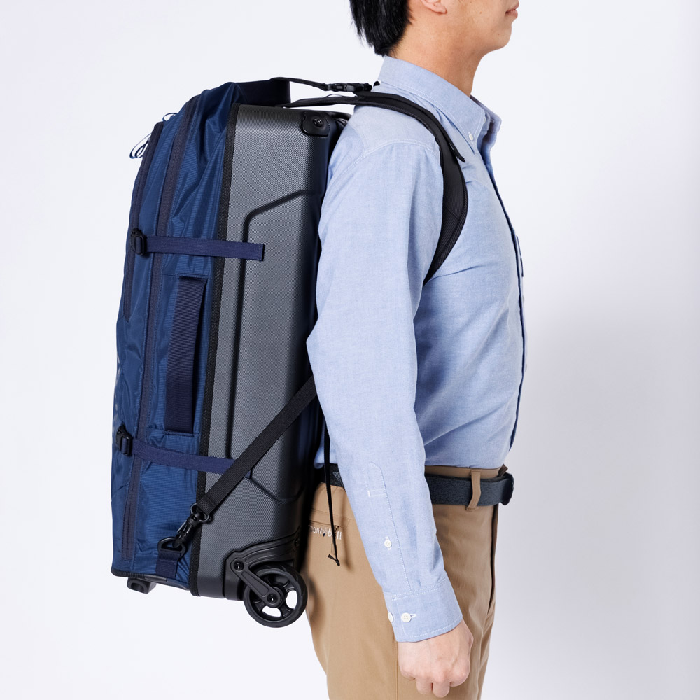 ウィーリーバッグ、4ウィールバッグを一時的に背負うための後付けショルダーハーネスです。簡単な装着方法により、足場の悪い場所や災害時などで使用できます。