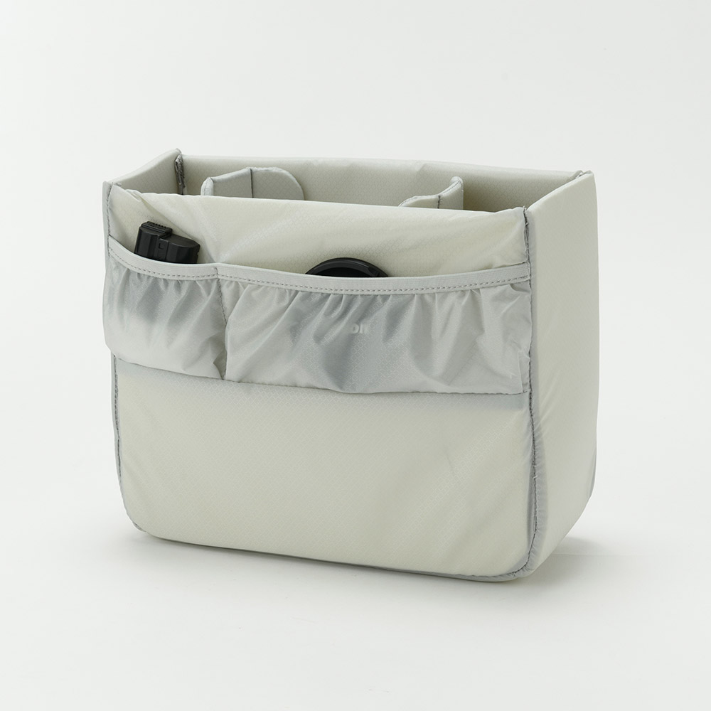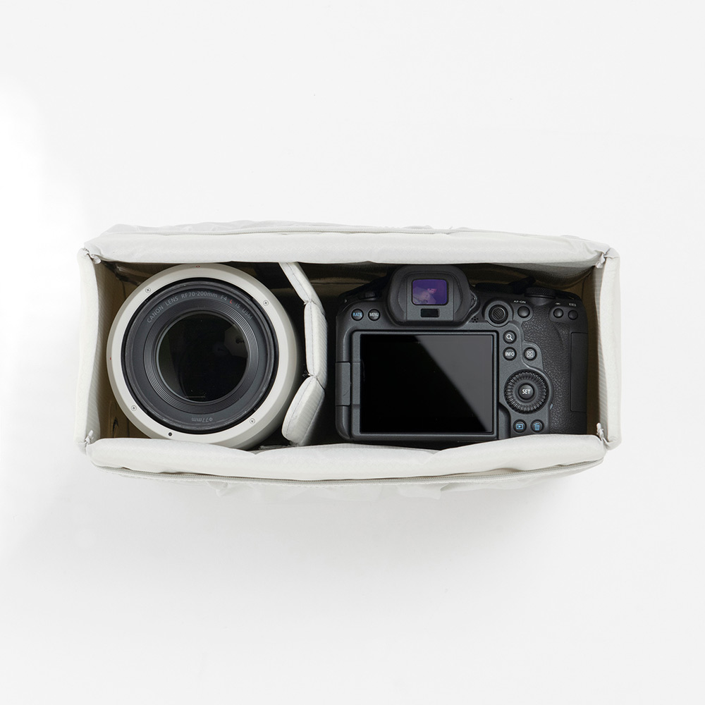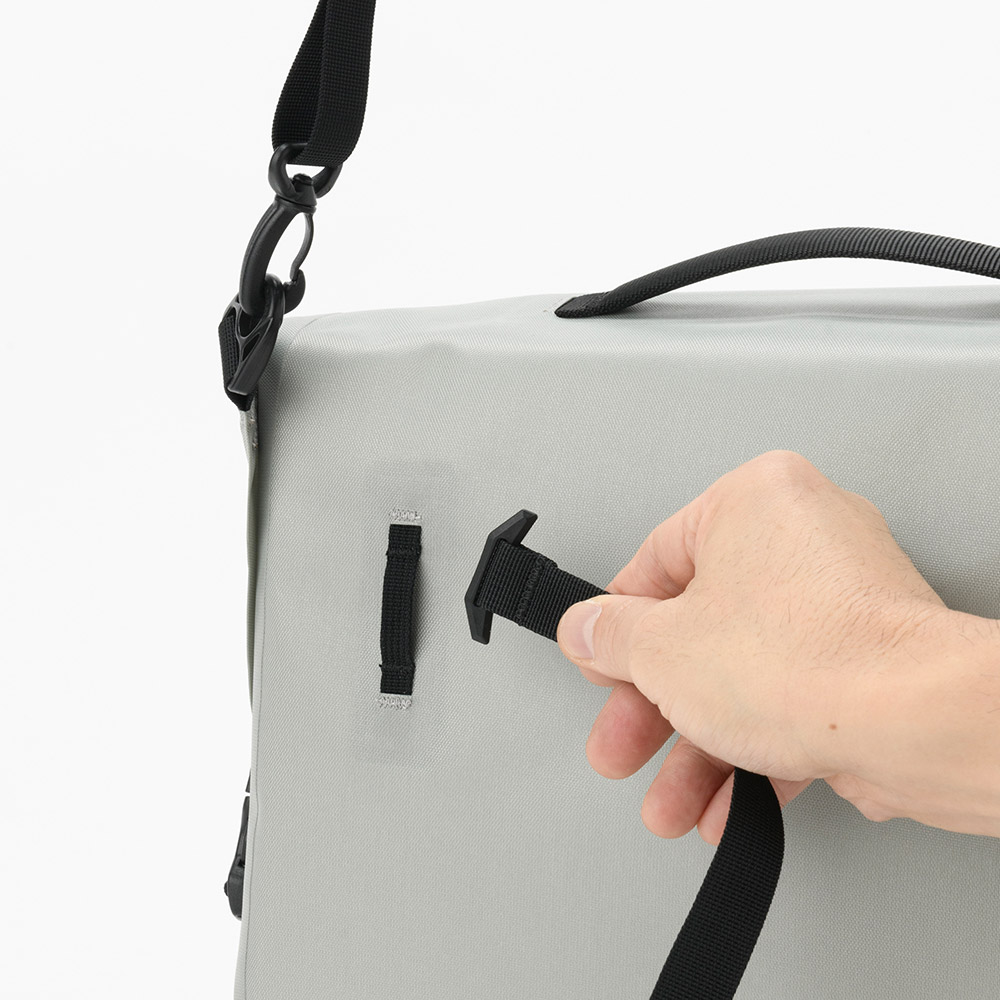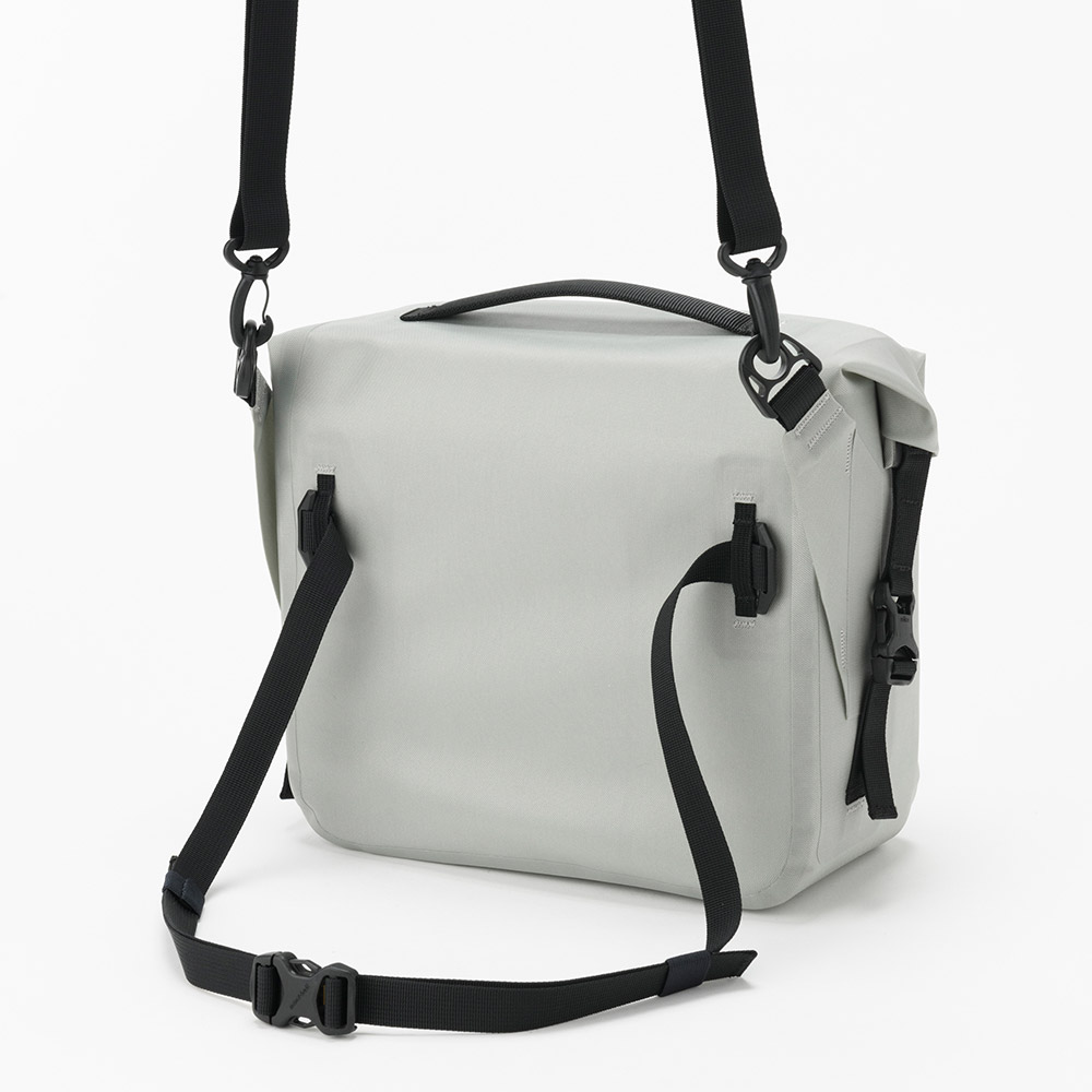 操作性・防水性に優れ、雨天時にもカメラや機材を濡らしにくいロールアップ方式のショルダーバッグです。接合部分にはウェルダー加工を施すことで防水性を高めています。ショルダーストラップと歩行時の揺れを抑制するウエストベルトは必要に応じて取り外しが可能です。前面下部にはバックルにより着脱がスムーズに行える三脚ホルダーを備えています。インナーバッグは取り外しが可能で、大きなサイドポケットと小さなサイドポケットを備えています。標準レンズを取り付けたフルサイズミラーレスカメラ1台と交換用レンズ1本が収納できる大きさです。