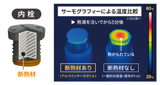 内栓は口径を大きくしながらも放熱を防ぐために、保温材を封入。保温・保冷性能を向上させています。