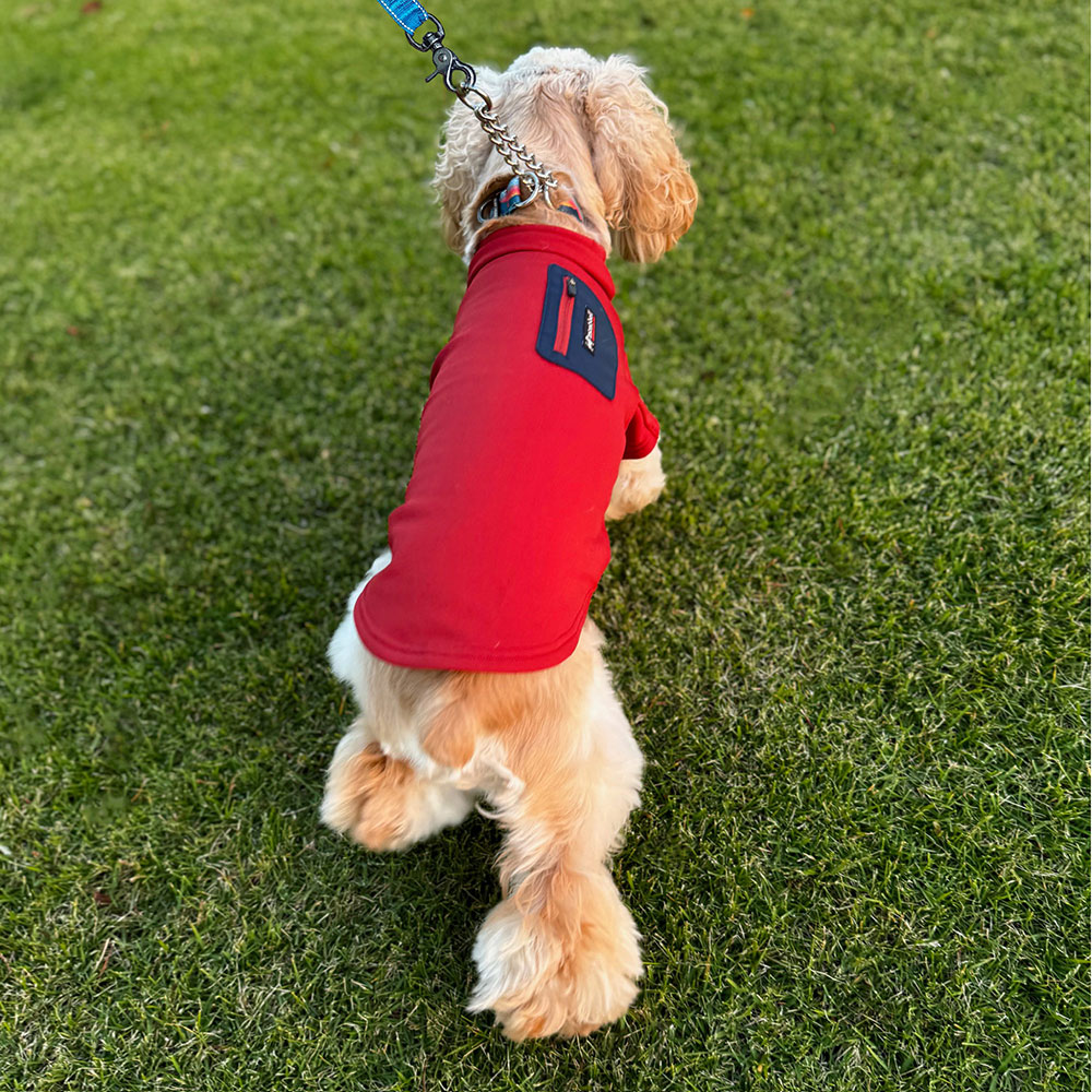 高いストレッチ性を備えるフリース素材を使用した犬用ウエアです。伸びが良いので着せやすく、フィット感に優れます。薄手ながら裏面起毛により優れた保温性を発揮します。表面は滑りがよく、雪や汚れなども付きにくくなっています。冬のお散歩や雪遊びにおすすめです。背面にジッパー付きポケットが一つ付いています。