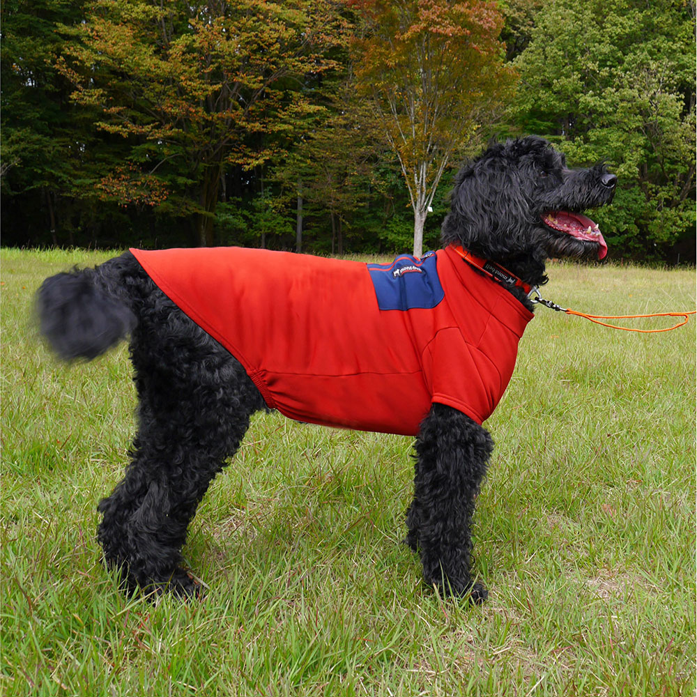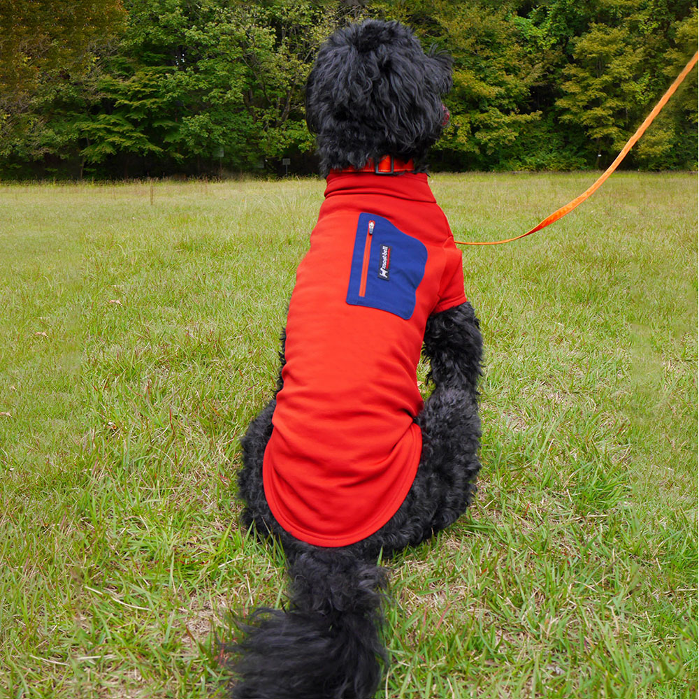 高いストレッチ性を備えるフリース素材を使用した犬用ウエアです。伸びが良いので着せやすく、フィット感に優れます。薄手ながら裏面起毛により優れた保温性を発揮します。表面は滑りがよく、雪や汚れなども付きにくくなっています。冬のお散歩や雪遊びにおすすめです。背面にジッパー付きポケットがあります。