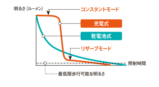 ※充電式は使用毎に充電することで、長い時間明るい状態(コンスタントモード)で使用することができます。
