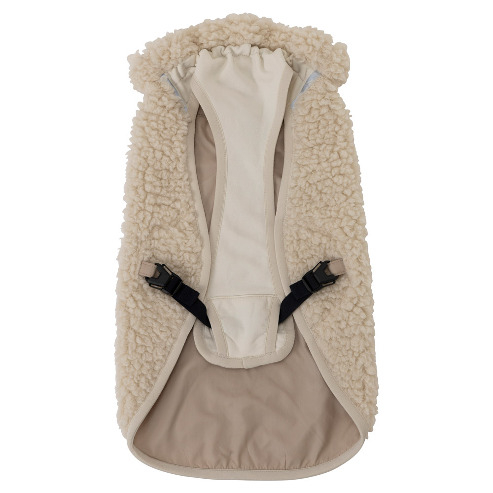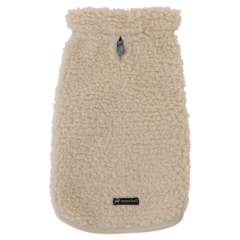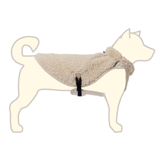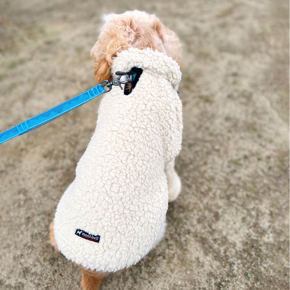 羊毛のようなモコモコとした風合いのクリマプラス®シーリングを使用した犬用ウエアです。保温性に優れた厚手のフリースで、裏地付きなので防風性も備えています。お腹側は表面が滑らかなフリース素材なので、雪や汚れなども付きにくくなっています。首回りはドローコードでフィット感が調節でき、背面首元にはリードを通せる穴があるため、カラー(首輪)の上から着用できます。(ハーネスのリード取り付け位置とは合わない場合があります)反射素材付きで夜間の安全性を高めています。