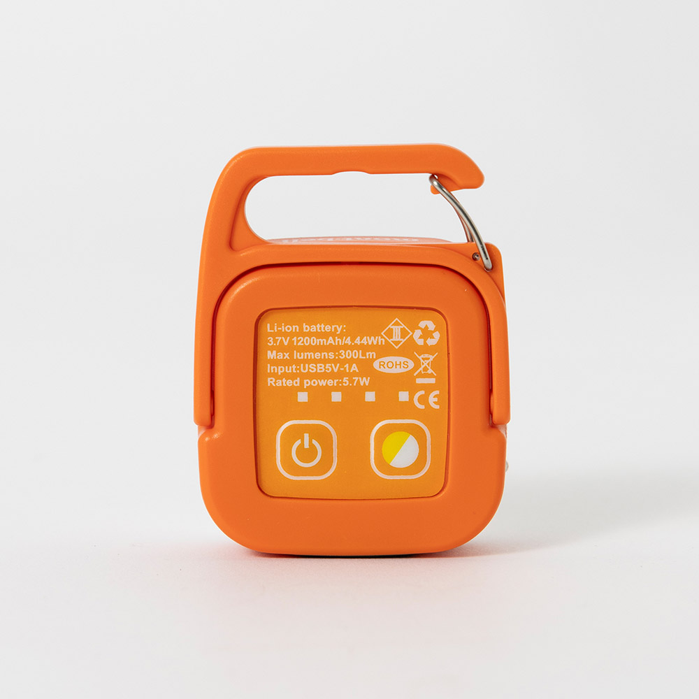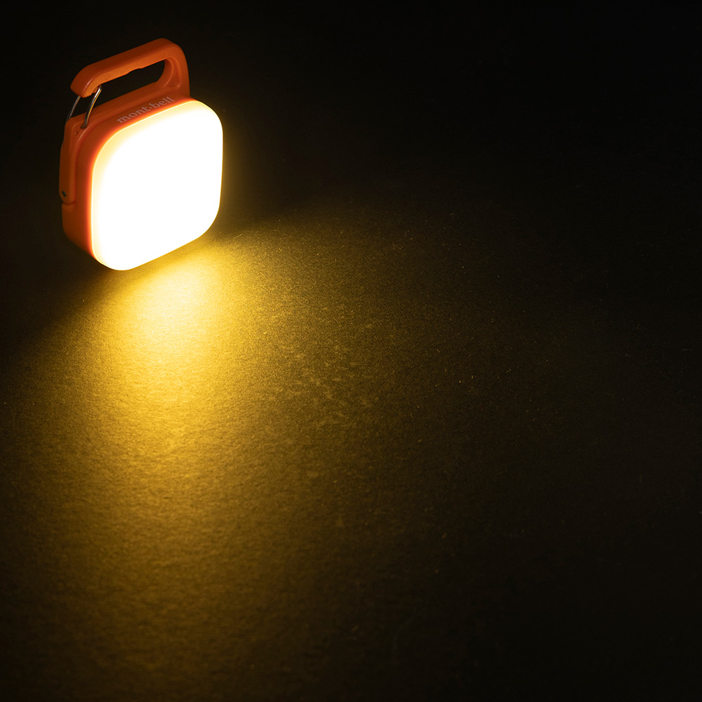 広範囲を照らすことができる面発光のミニランプです。ワイヤーゲートのフックがついています。キャンプでのテント内吊り下げライトとして、通勤通学の帰りの夜道や犬の散歩のセイフティライトとしてなど、さまざまなシーンで使用できます。明るさは3段階、ライトの色は白色、電球色、赤色の点滅の3種類を切り替えられます。充電ポートはUSB Type-Cです。